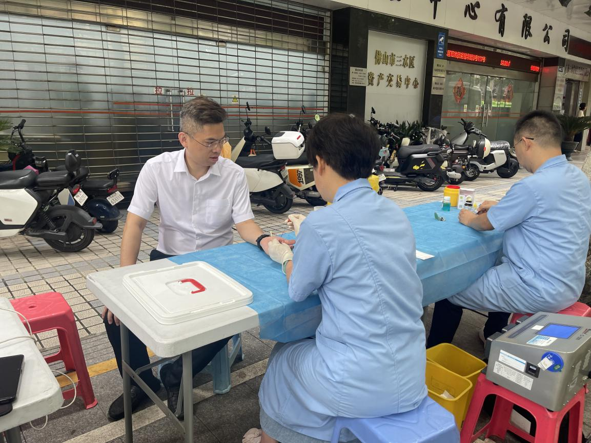 上午8点45分,血站工作人员已来到公司门前开展有关的准备工作。今天的天气清凉舒适,大家的献血热情很高涨,现场气氛十分热烈。在医护人员的引导下,大家填写献血登记表、测量血压、抽血化验,现场有条不紊、秩序井然。