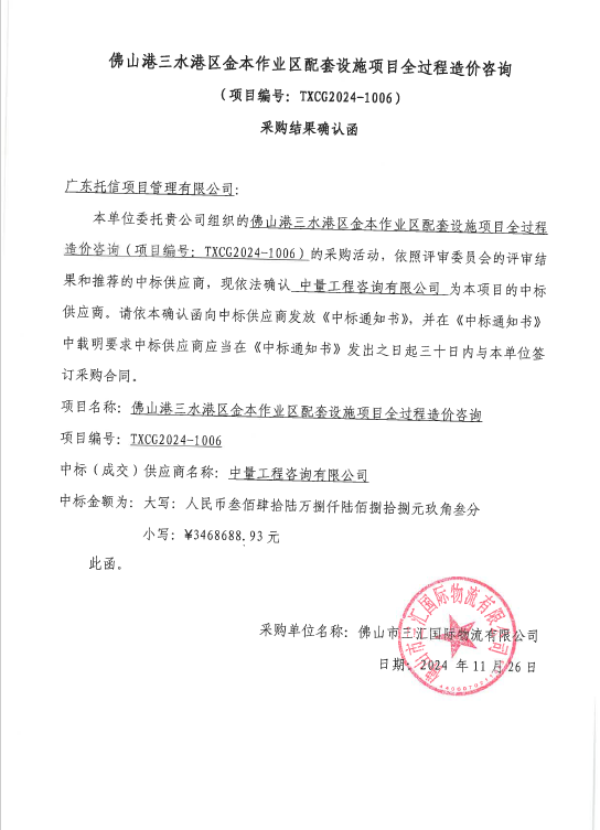 佛山港三水港区金本作业区配套设施项目全过程造价咨询结果公告