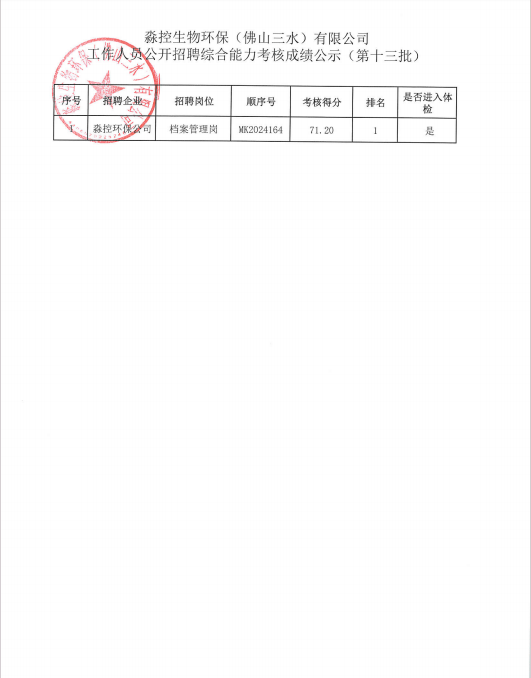 淼控生物环保(佛山三水)有限公司工作人员综合能力考核成绩公示(第十三批)
