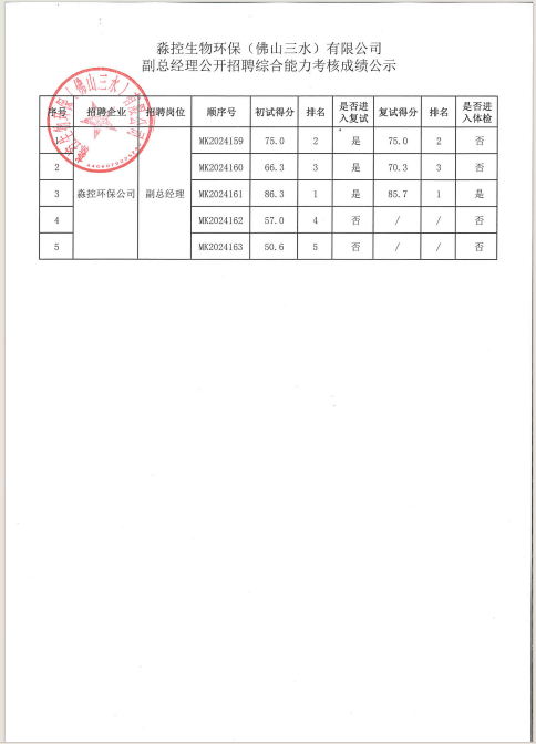 淼控生物环保(佛山三水)有限公司副总经理公开招聘综合能力考核成绩公示