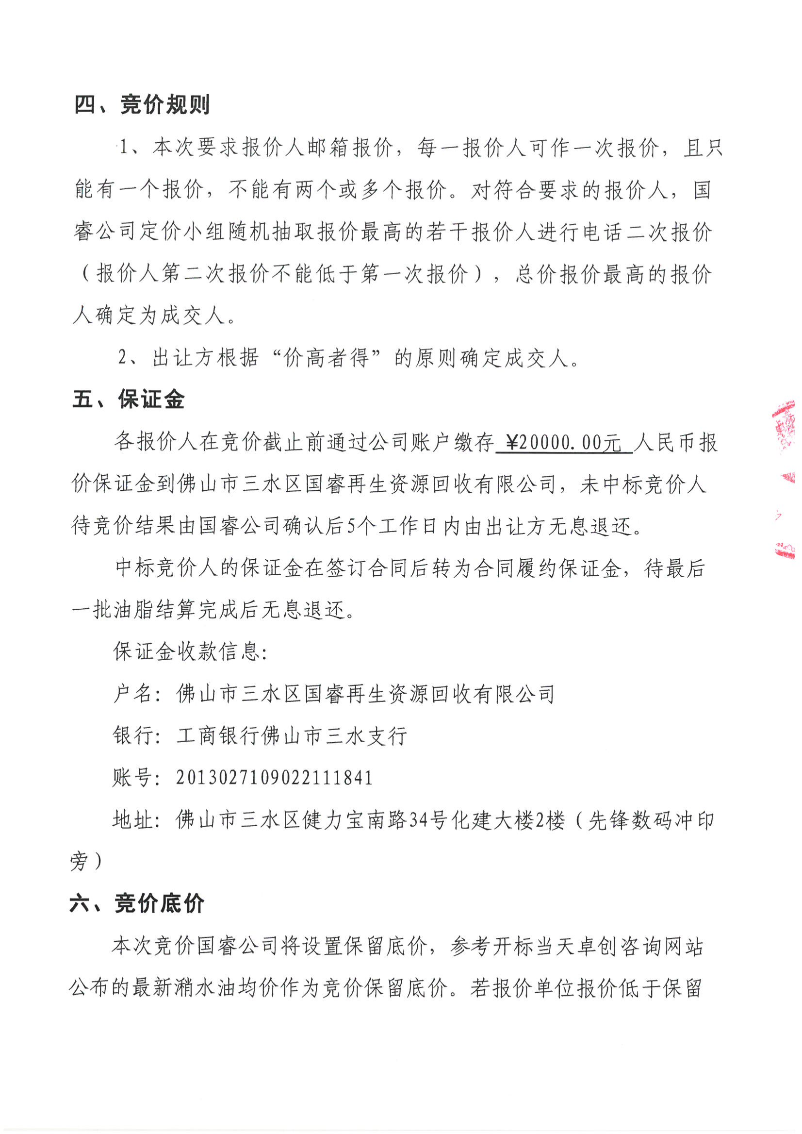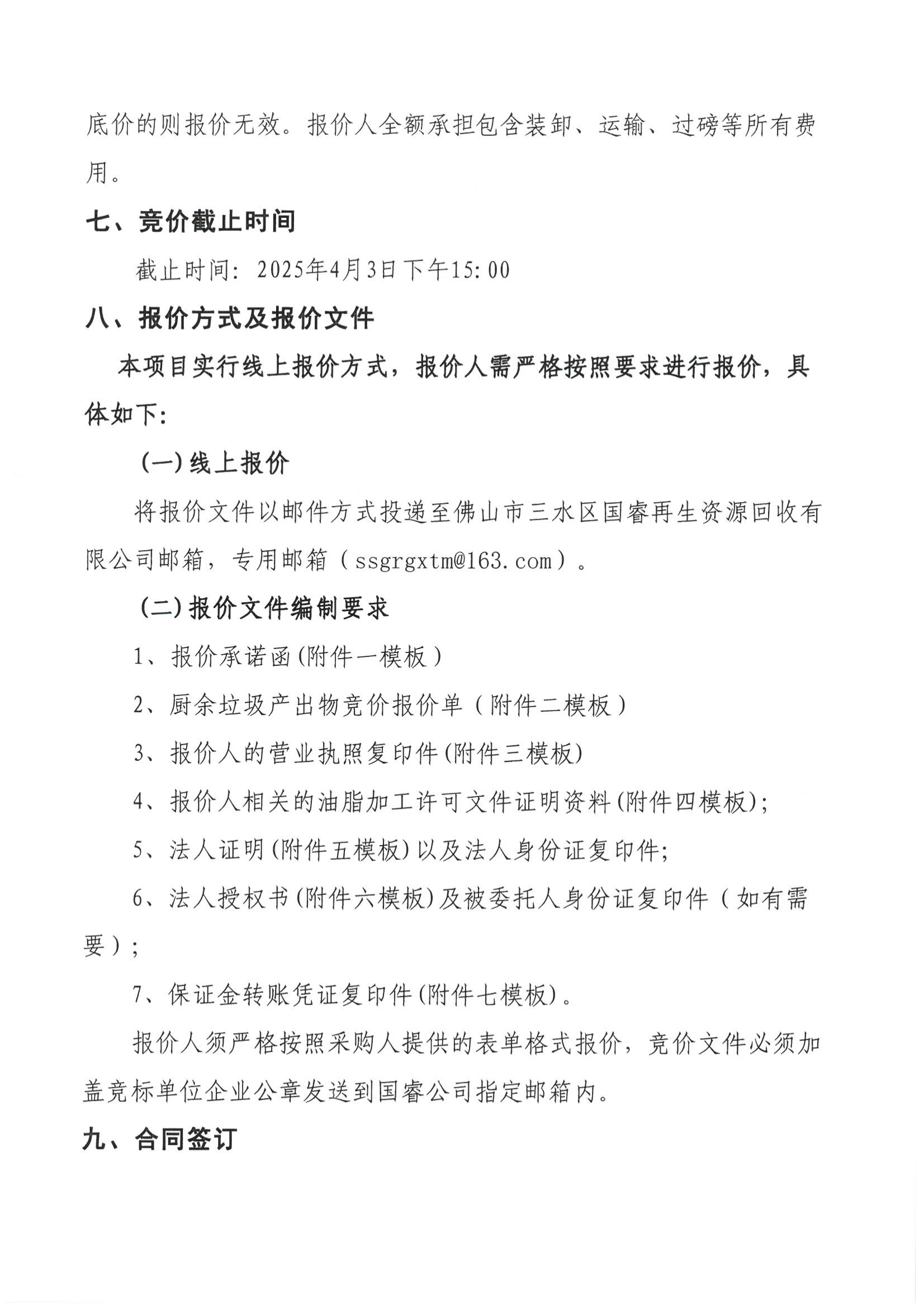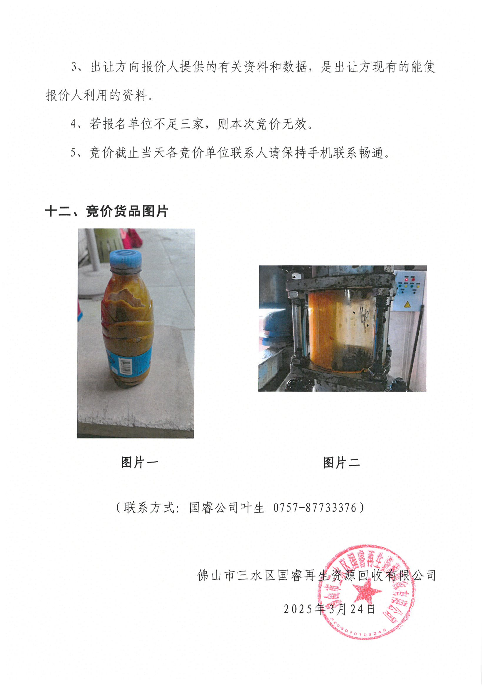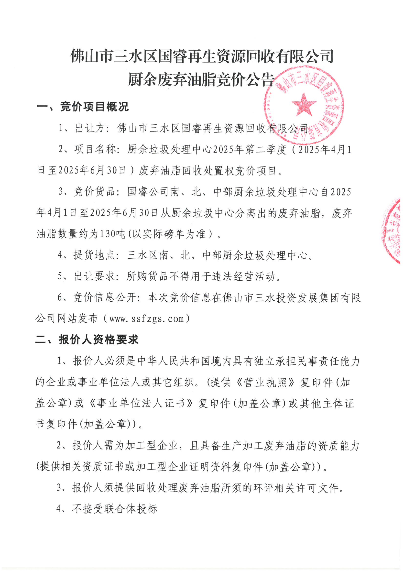 佛山市三水区国睿再生资源回收有限公司厨余废弃油脂竞价公告