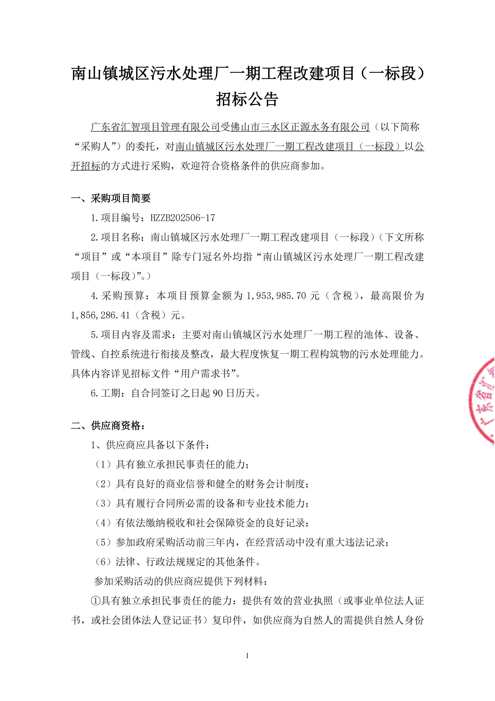 南山镇城区污水处理厂一期工程改建项目(一标段)招标公告