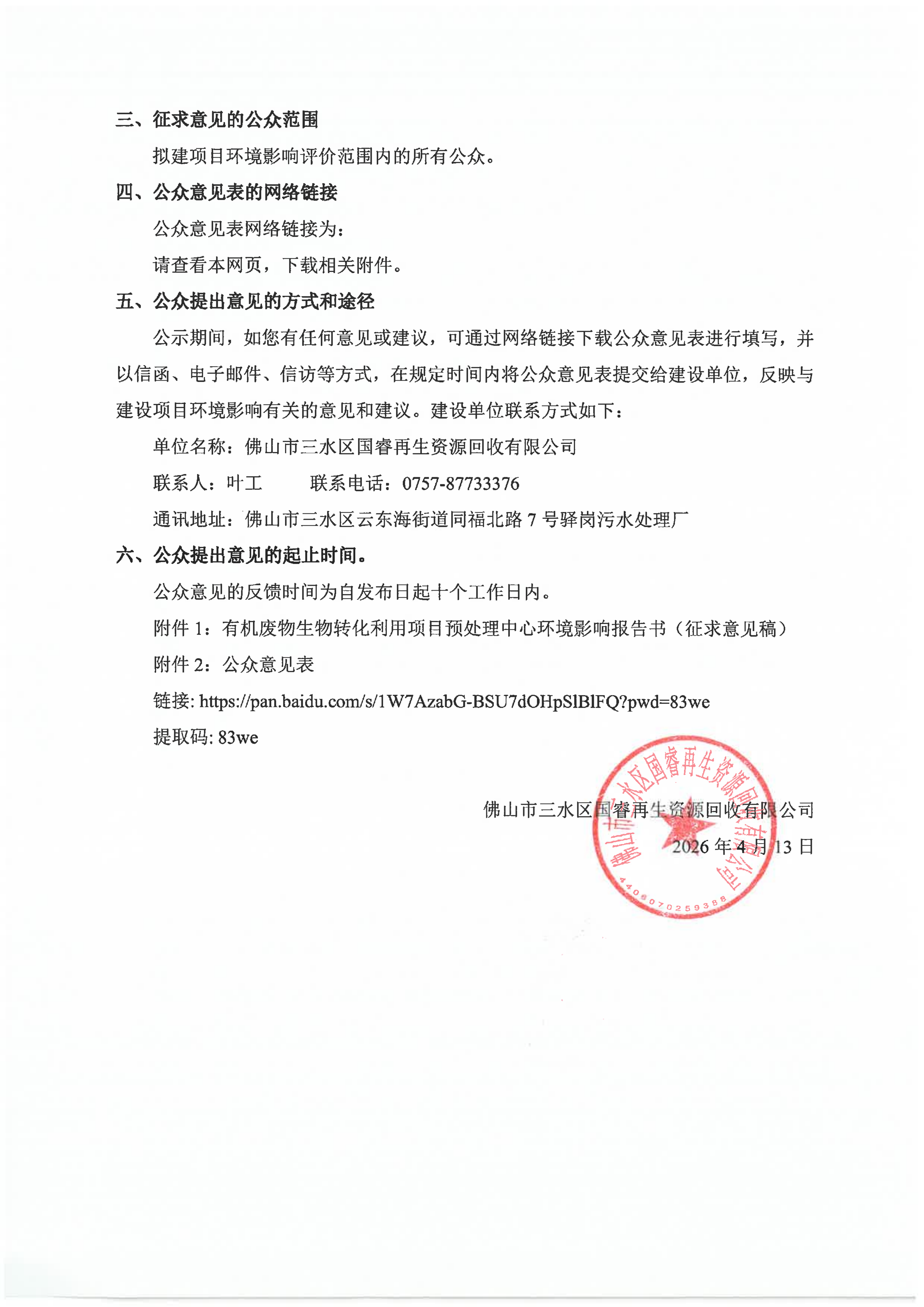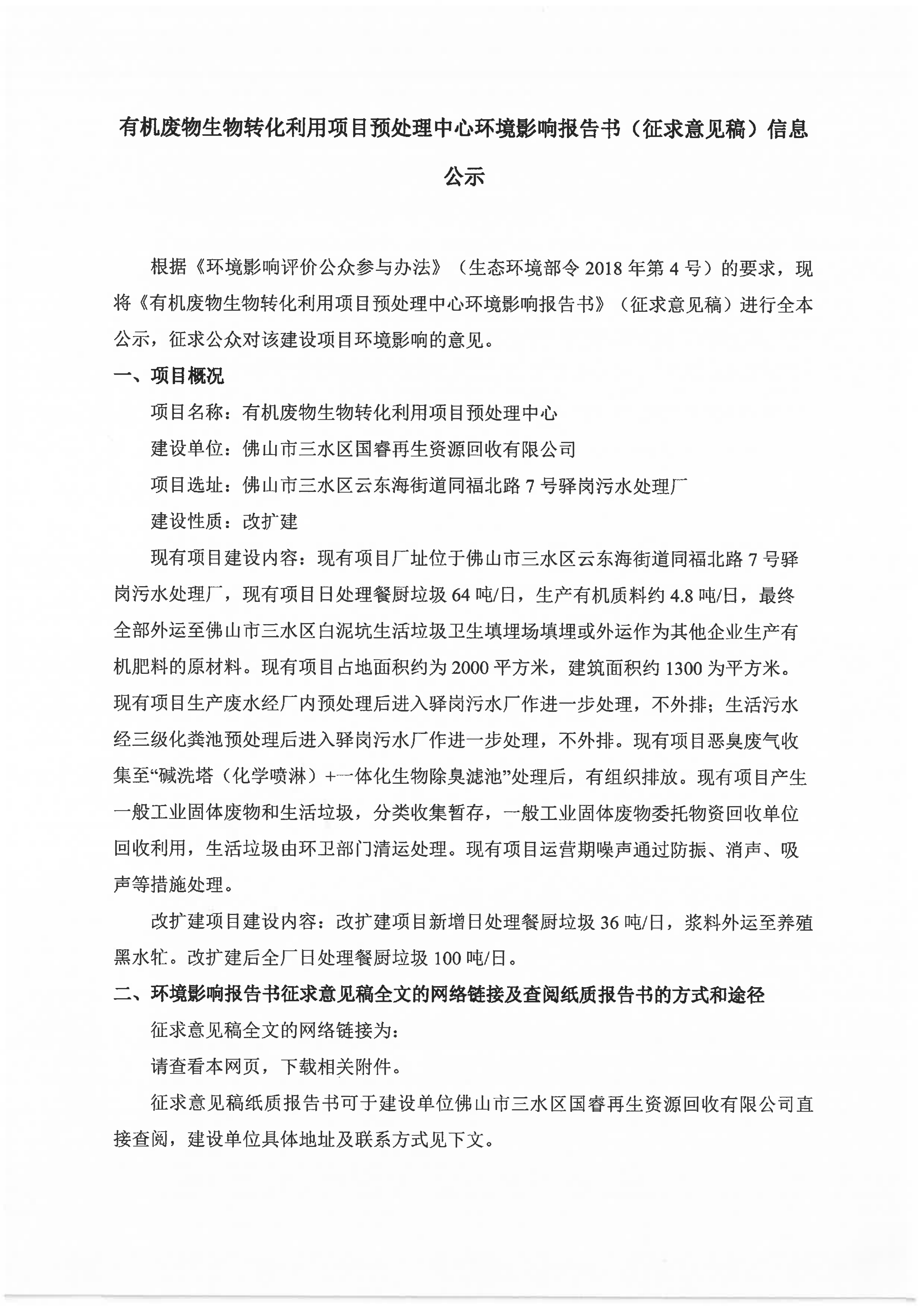 有机废物生物转化利用项目预处理中心环境影响报告书(征求意见稿)信息公示