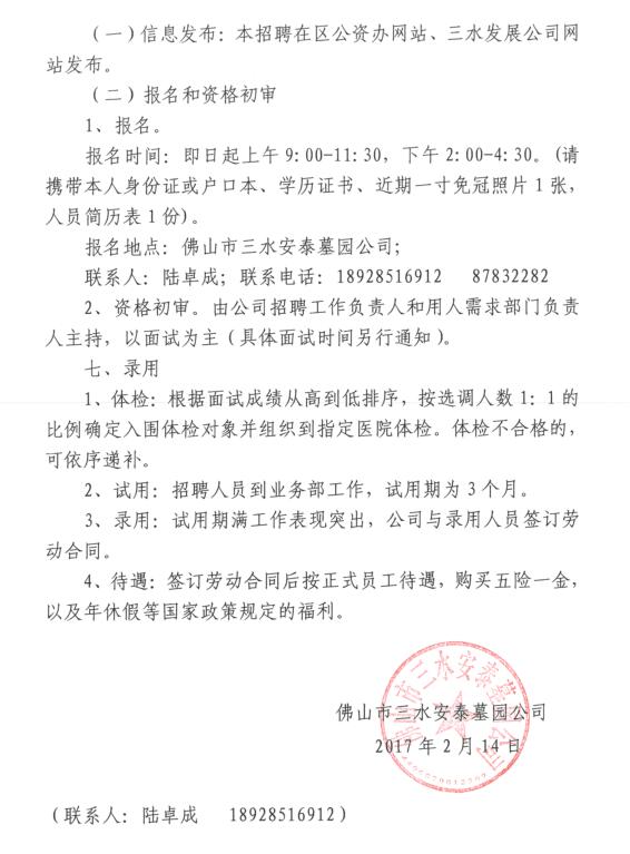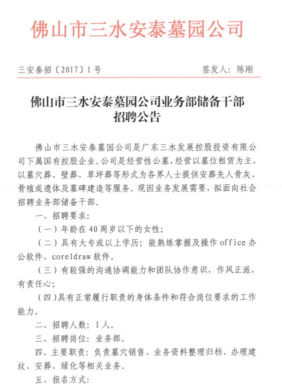 佛山市三水安泰墓园公司业务部储备干部招聘公告
