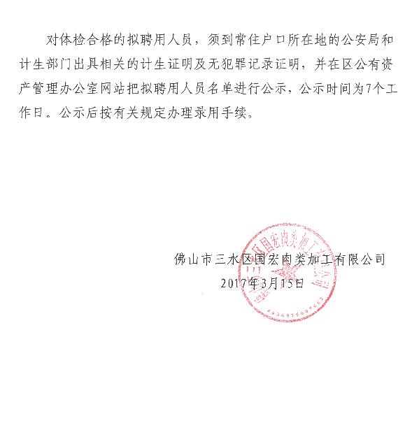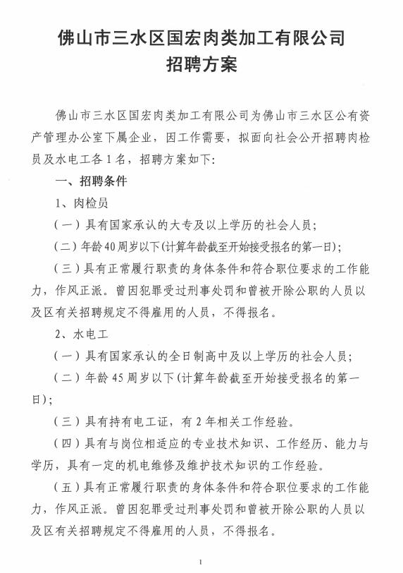 佛山市三水区国宏肉类加工有限公司招聘方案