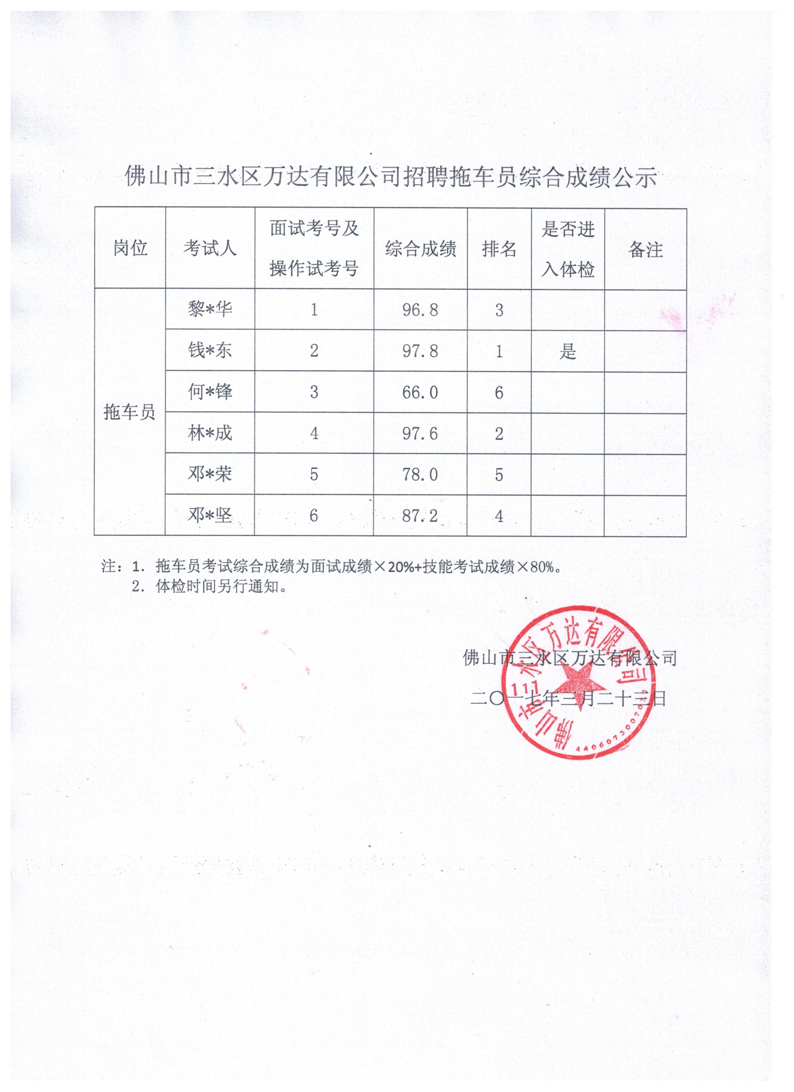 佛山市三水区万达有限公司招聘拖车员综合成绩公示