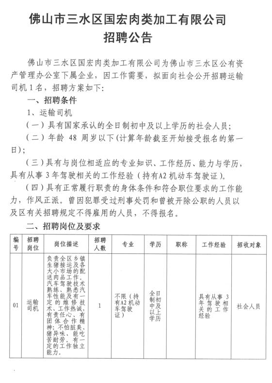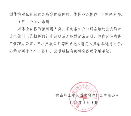 佛山市三水区国宏肉类加工有限公司招聘公告