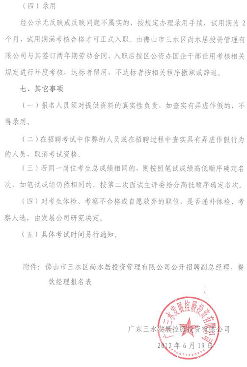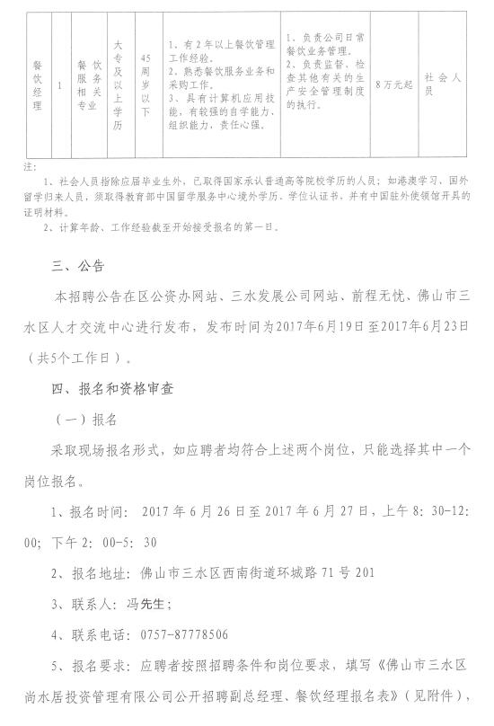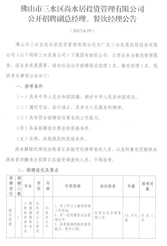 佛山市三水区尚水居投资管理有限公司公开招聘副总经理、餐饮经理公告