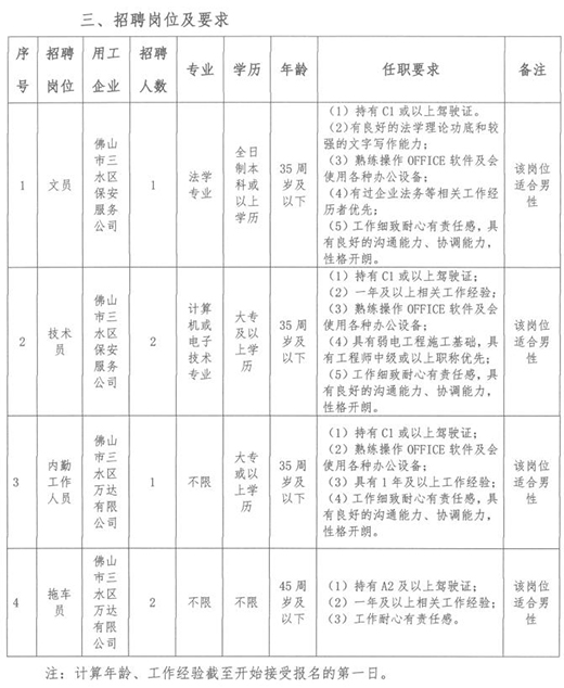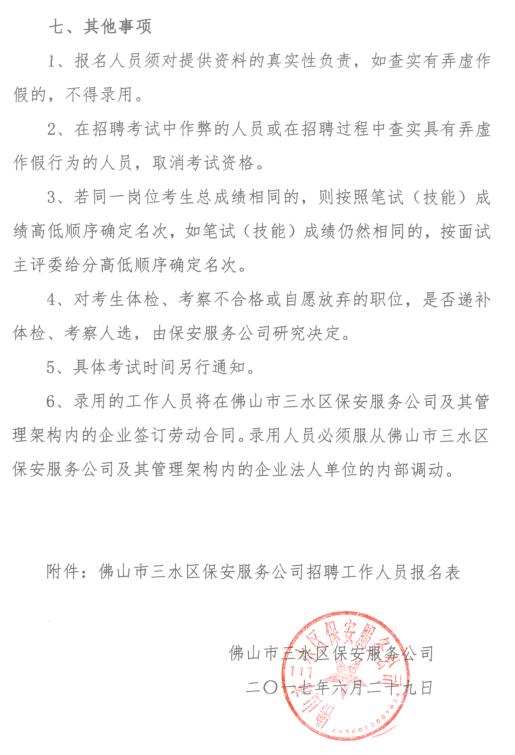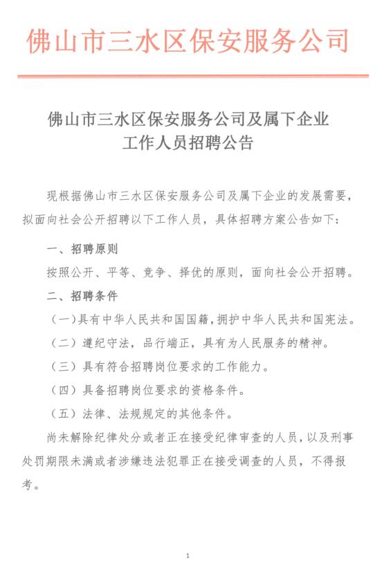 佛山市三水区保安服务公司及属下企业工作人员招聘公告