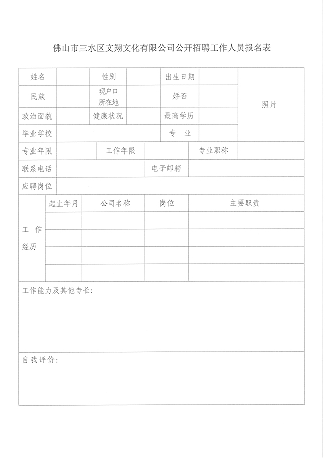附件:佛山市三水区文翔文化有限公司公开招聘工作人员报名表