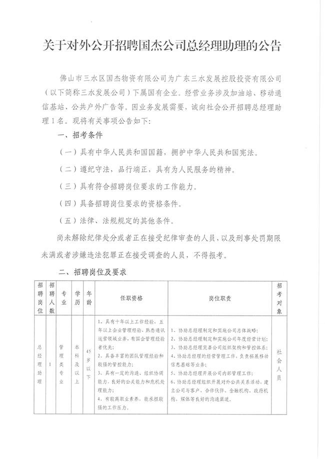 附件:佛山市三水区国杰物资有限公司公开招聘总经理助理报名表