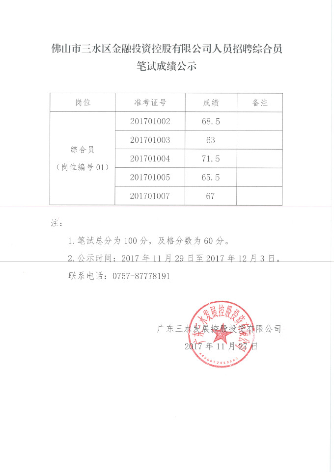 佛山市三水区金融投资控股有限公司人员招聘综合员笔试成绩公示