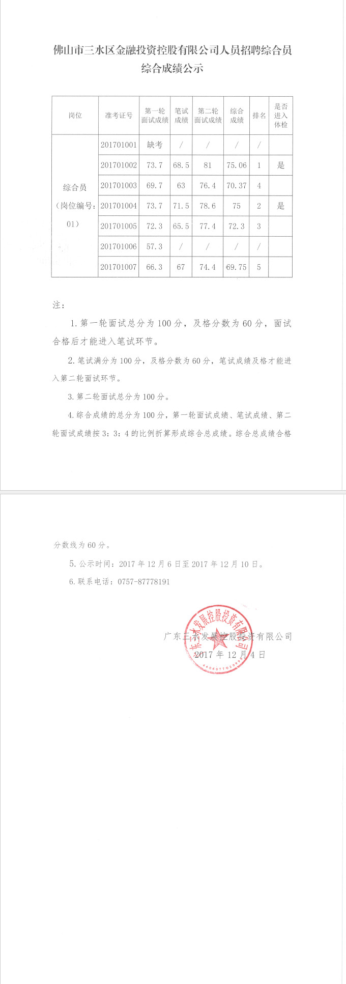 佛山市三水区金融投资控股有限公司人员招聘综合员综合成绩公示