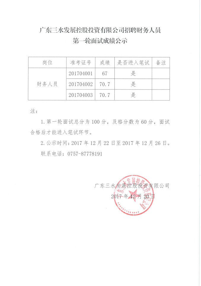 广东PA视讯集团游戏控股投资有限公司招聘财务人员第一轮面试成绩公示