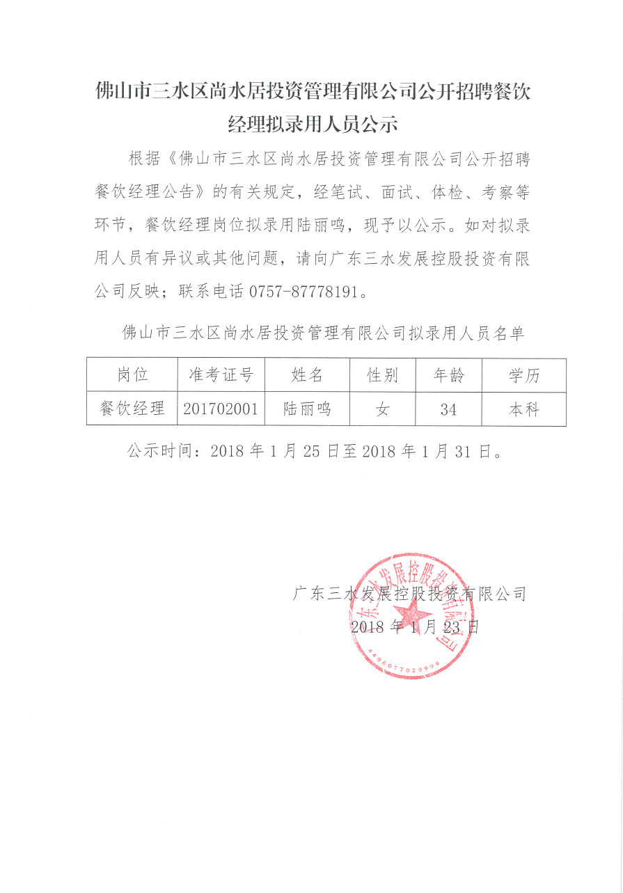 佛山市三水区尚水居投资管理有限公司公开招聘餐饮经理拟录用人员公示