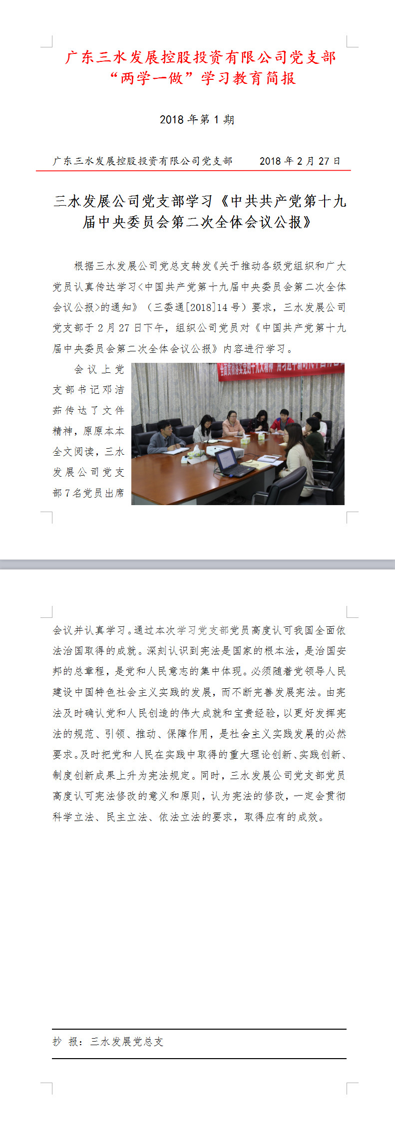 PA视讯集团游戏公司“两学一做”学习教育简报第1期——学习《中共共产党第十九届中央委员会第二次全体会议公报》