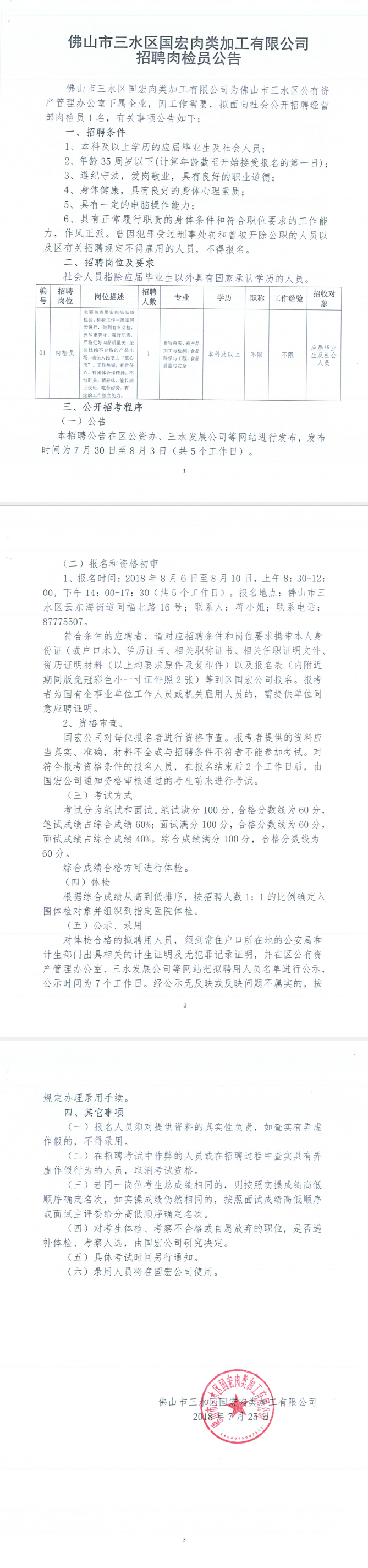 佛山市三水区国宏肉类加工有限公司招聘肉检员公告