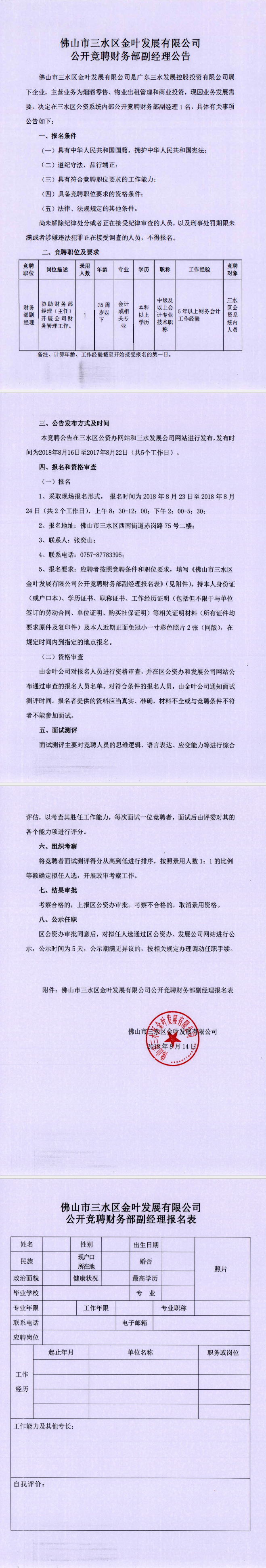 佛山市三水区金叶发展有限公司公开竞聘财务部副经理公告