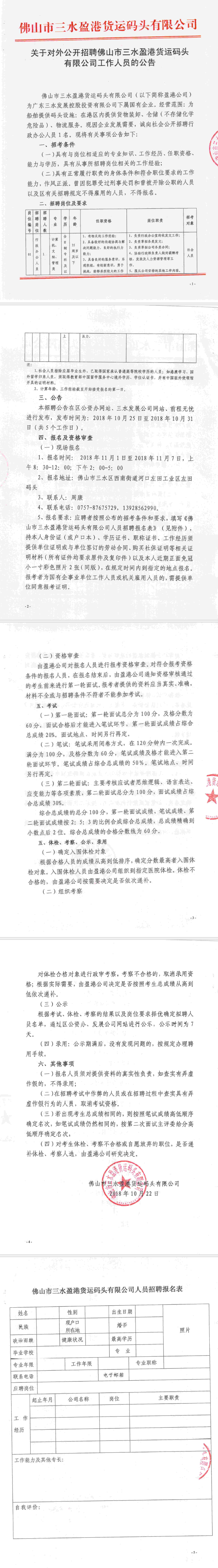 佛山市三水盈港货运码头有限公司公开招聘行政办公人员公告