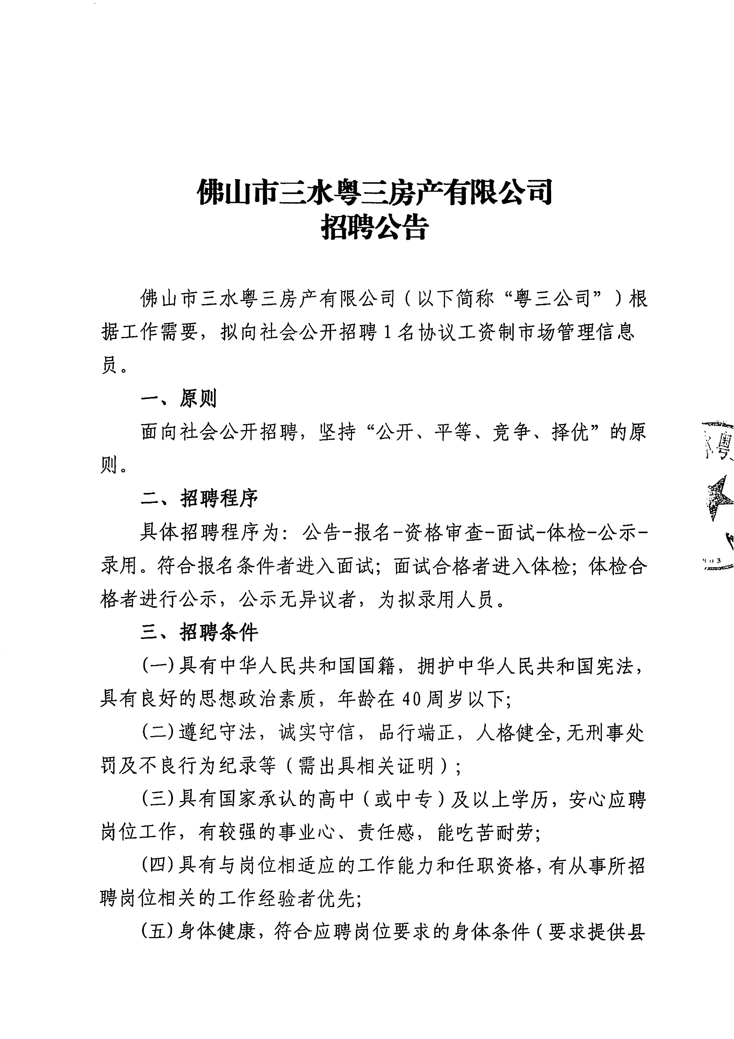 佛山市三水粤三房产有限公司招聘公告