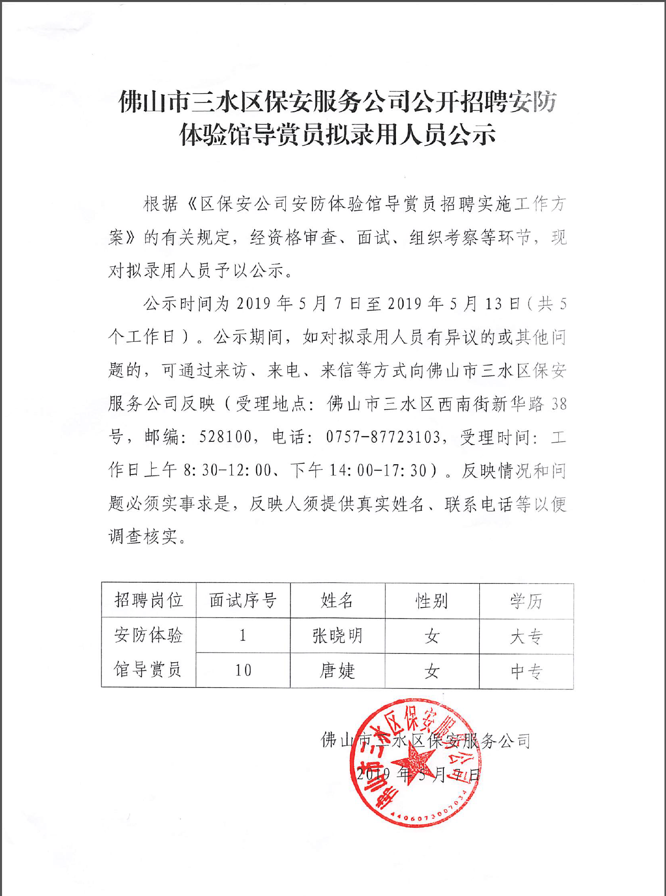 佛山市三水区保安服务公司公开招聘安防体验馆导赏员拟录用人员公示