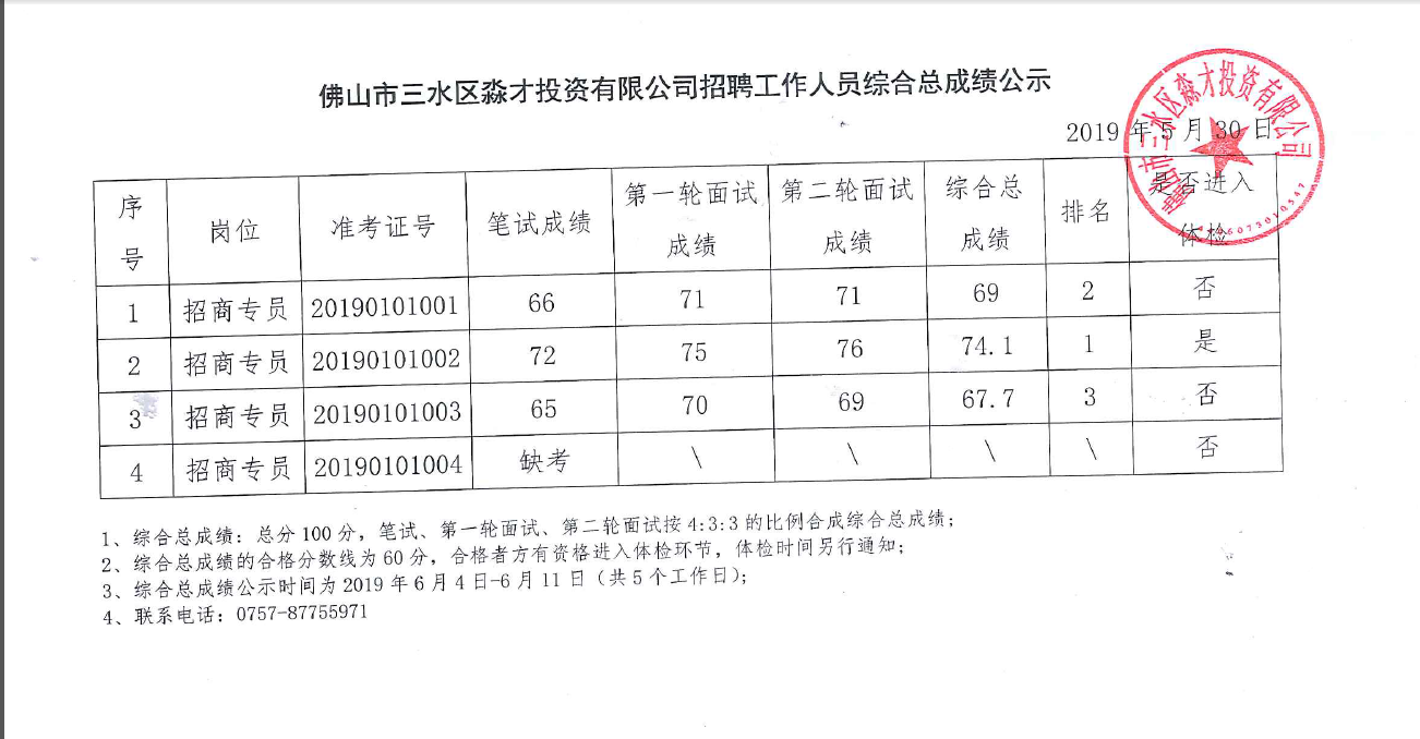 佛山市三水区淼才投资有限公司招聘工作人员综合总成绩公示