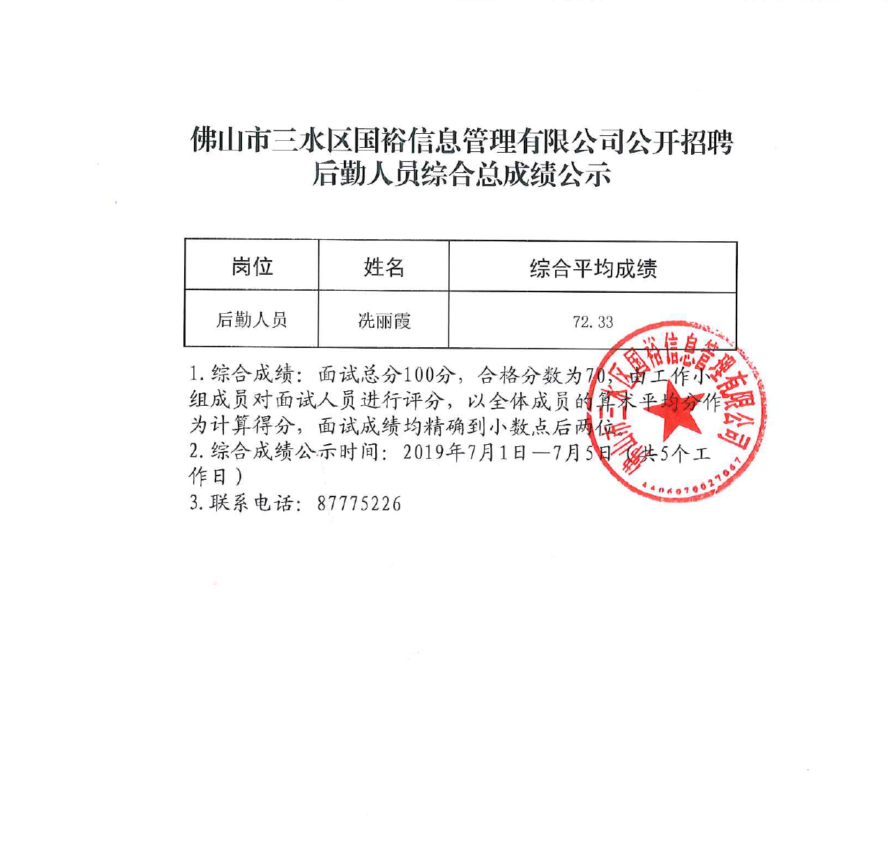 佛山市三水区国裕信息管理有限公司公开招聘后勤人员综合总成绩公示