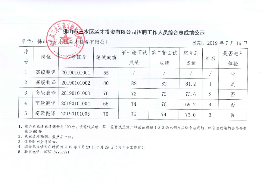 佛山市三水区淼才投资有限公司招聘工作人员综合总成绩公示