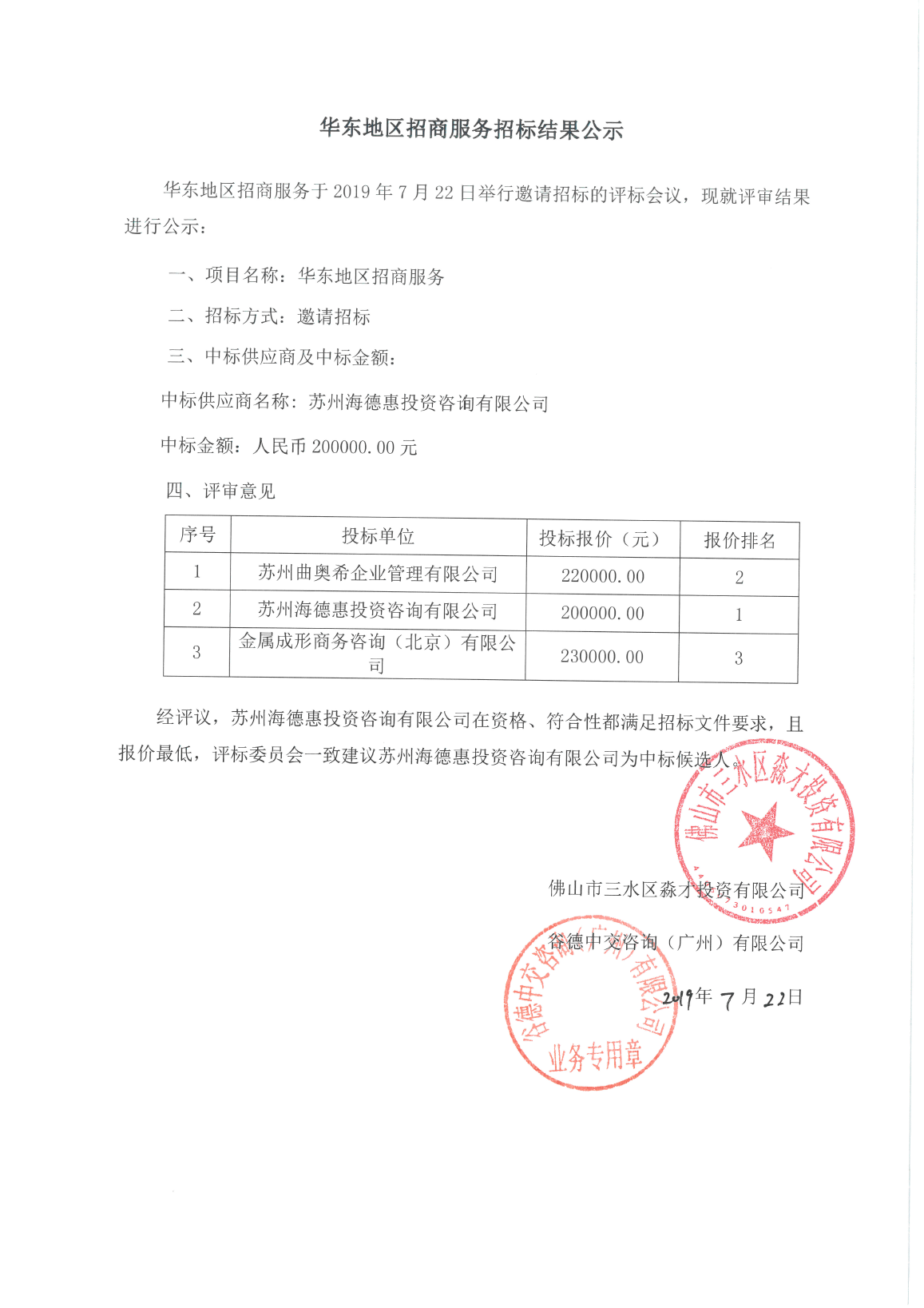 佛山三水区淼才投资有限公司华东地区招商服务招标结果公示