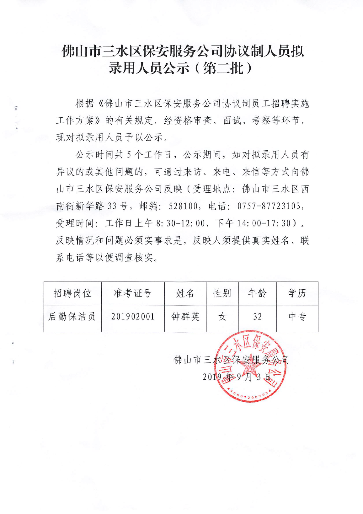 佛山市三水区保安服务公司协议制人员拟录用人员公示(第二批)