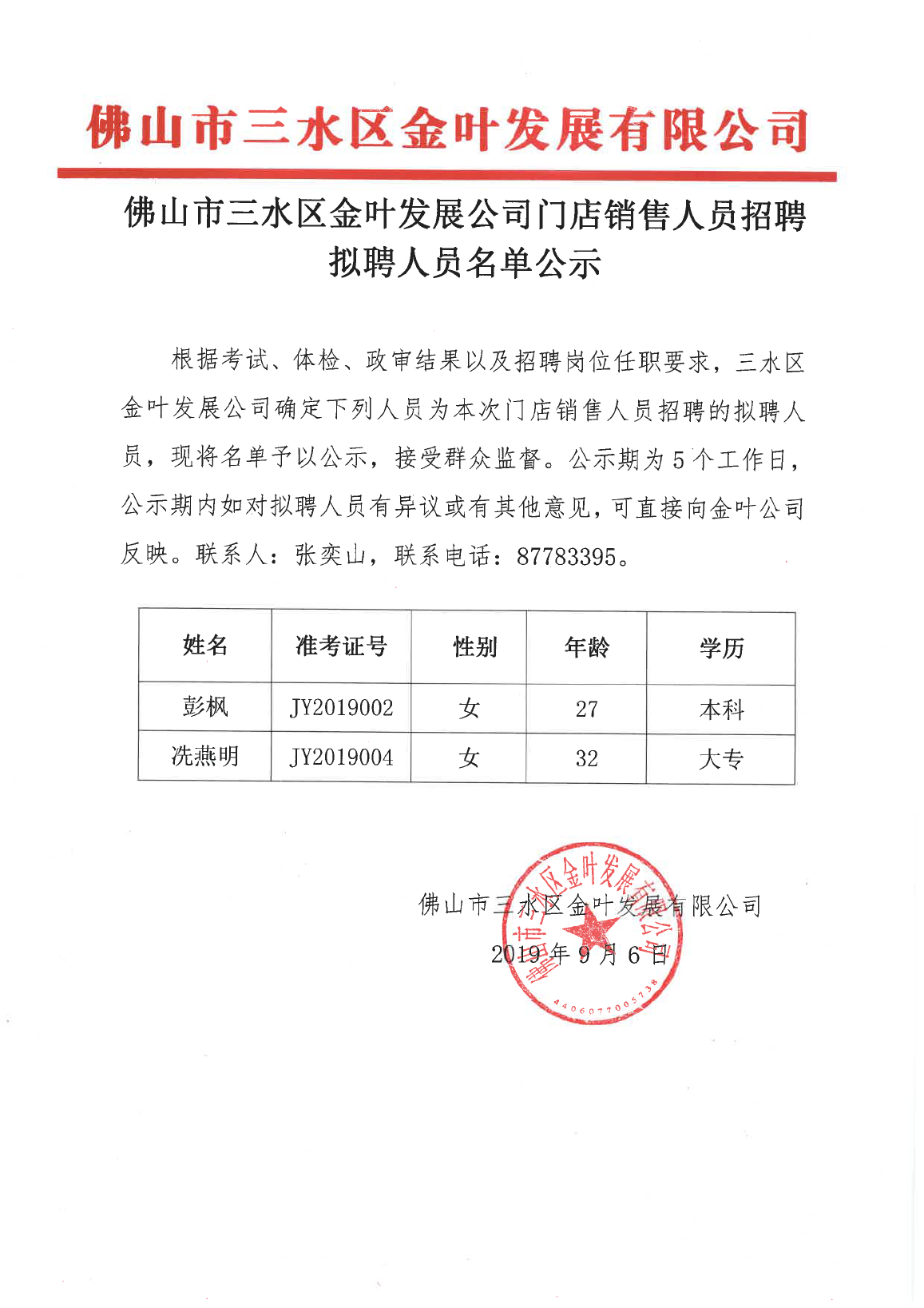 佛山市三水区金叶发展有限公司门店销售人员招聘拟聘人员名单公示