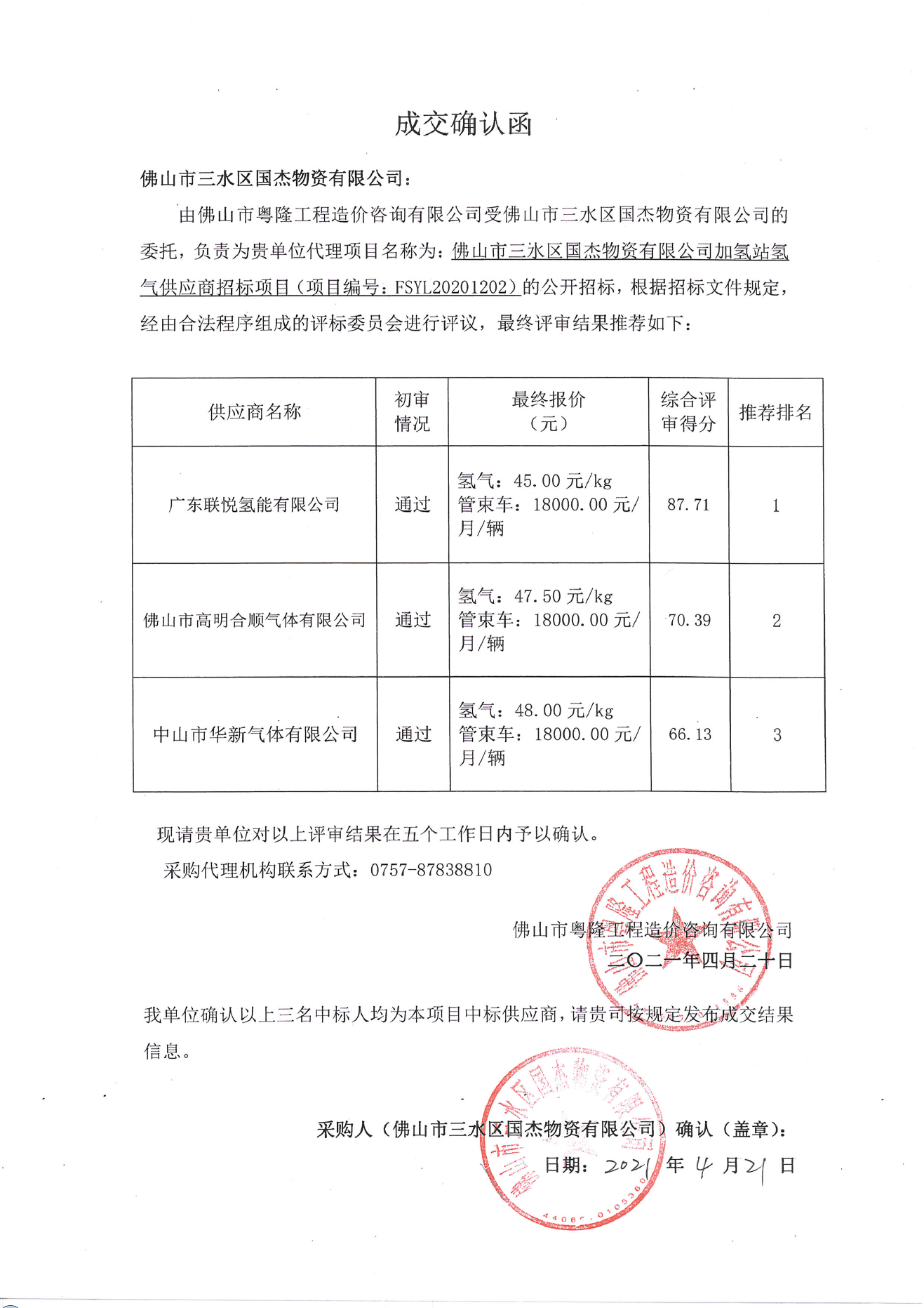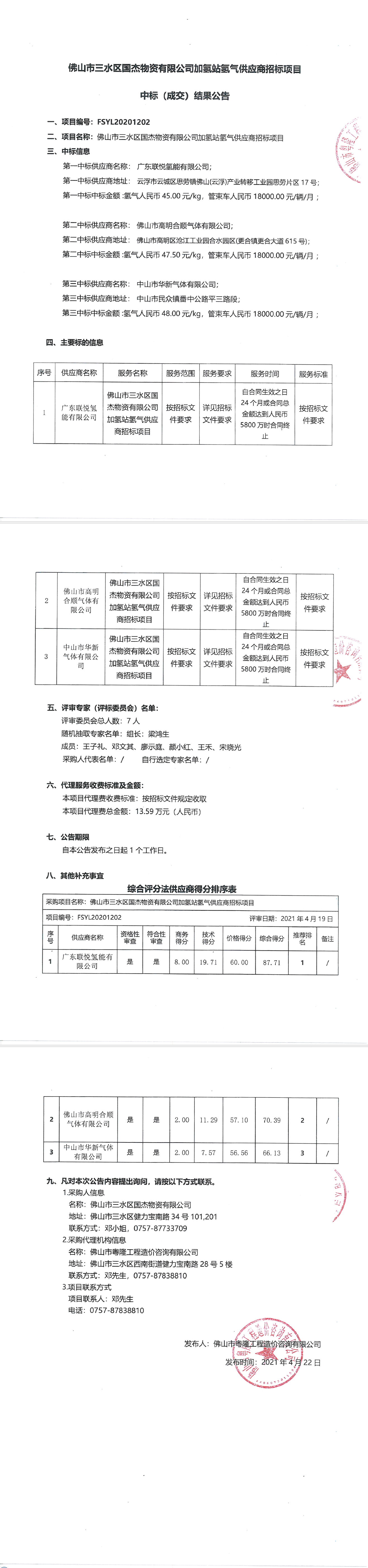 佛山市三水区国杰物资有限公司加氢站氢气供应商招标项目中标(成交)结果公告