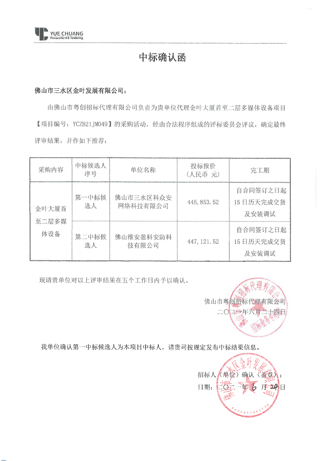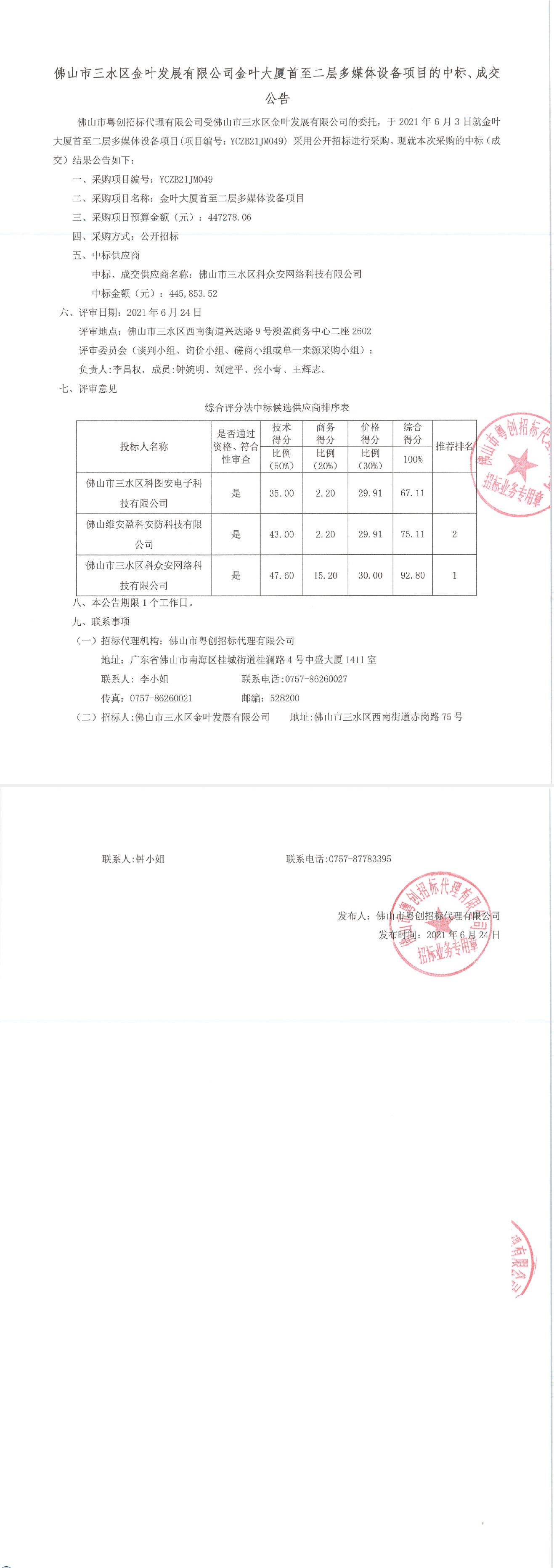 佛山市三水区金叶发展有限公司金叶大厦首至二层多媒体设备项目的中标、成交公告