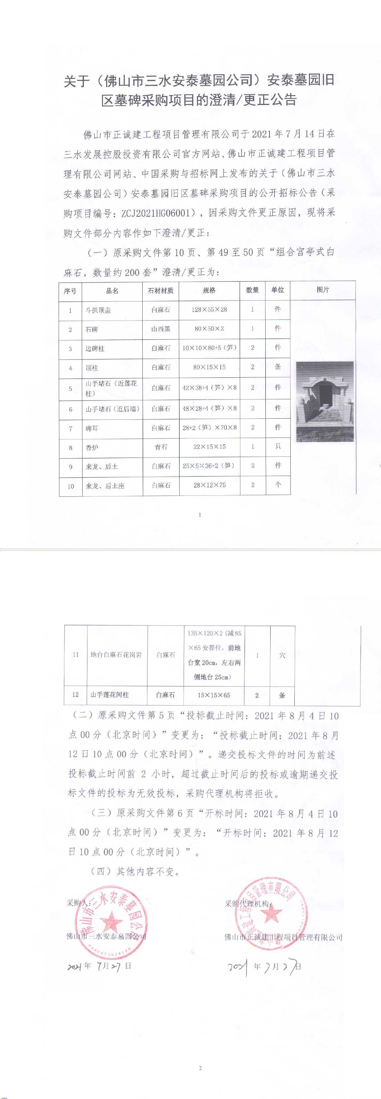 关于(佛山市三水安泰墓园公司)安泰墓园旧区墓碑采购项目的澄清更正公告