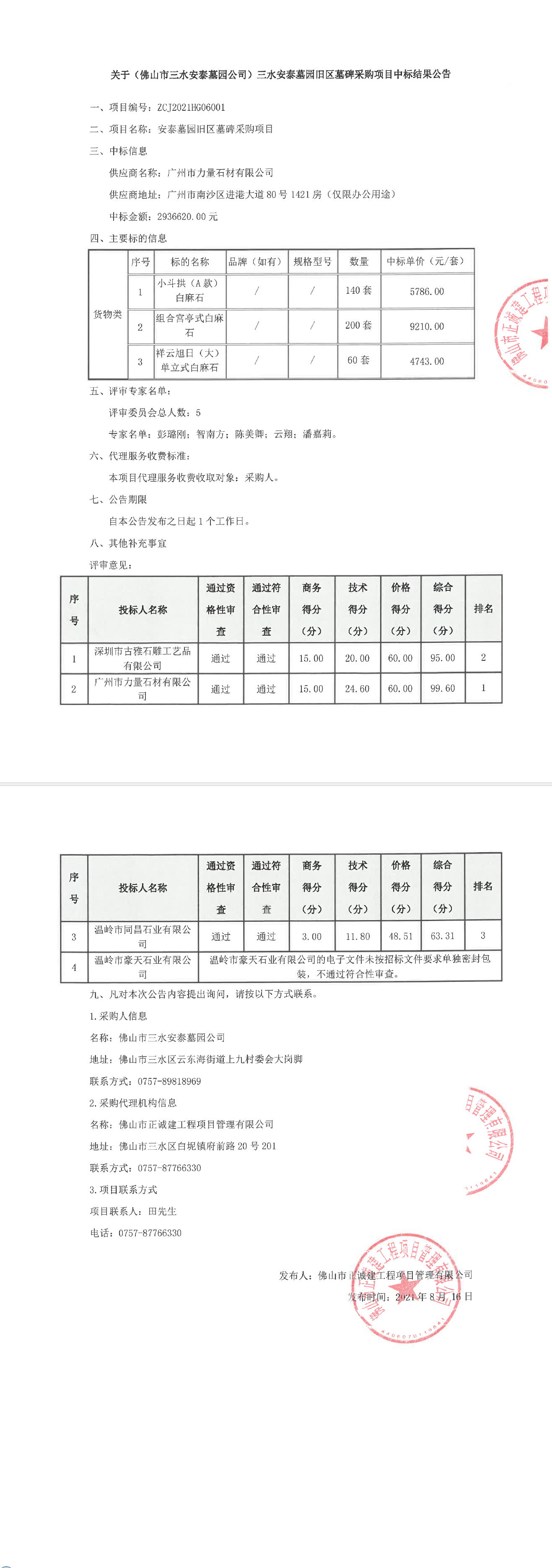 关于(佛山市三水安泰墓园公司)三水安泰墓园旧区墓碑采购项目中标结果公告