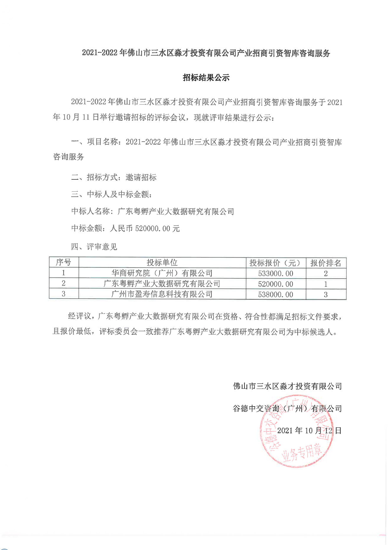 2021-2022年佛山市三水区淼才投资有限公司产业招商引资智库咨询服务招标结果公示