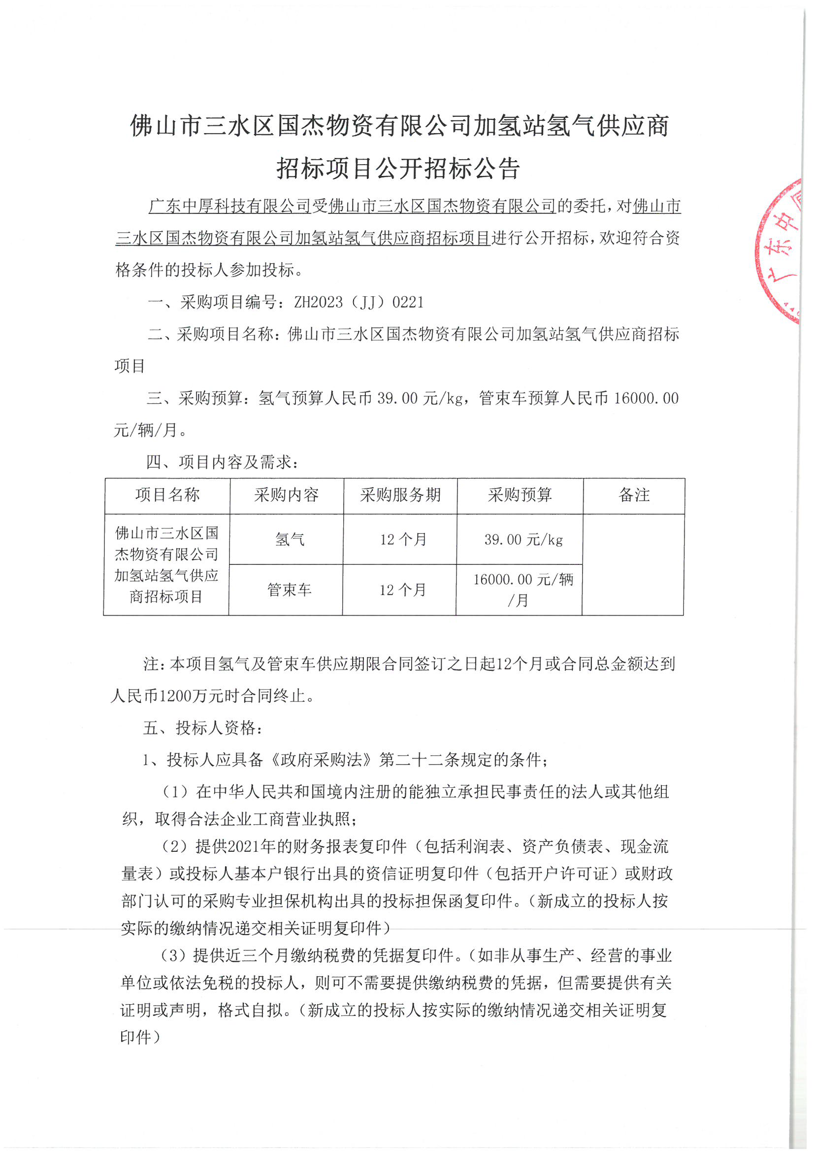 佛山市三水区国杰物资有限公司加氢站氢气供应商招标项目公开招标公告