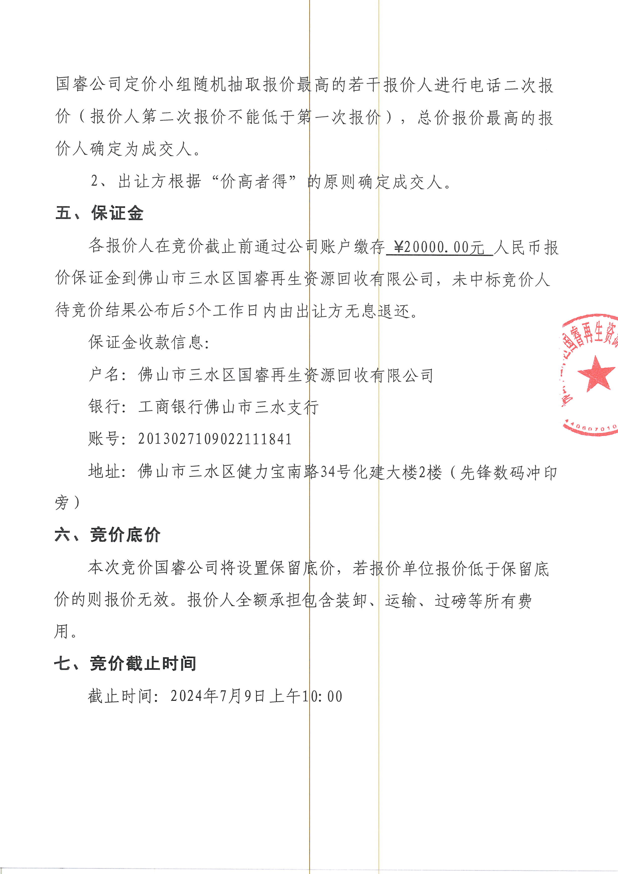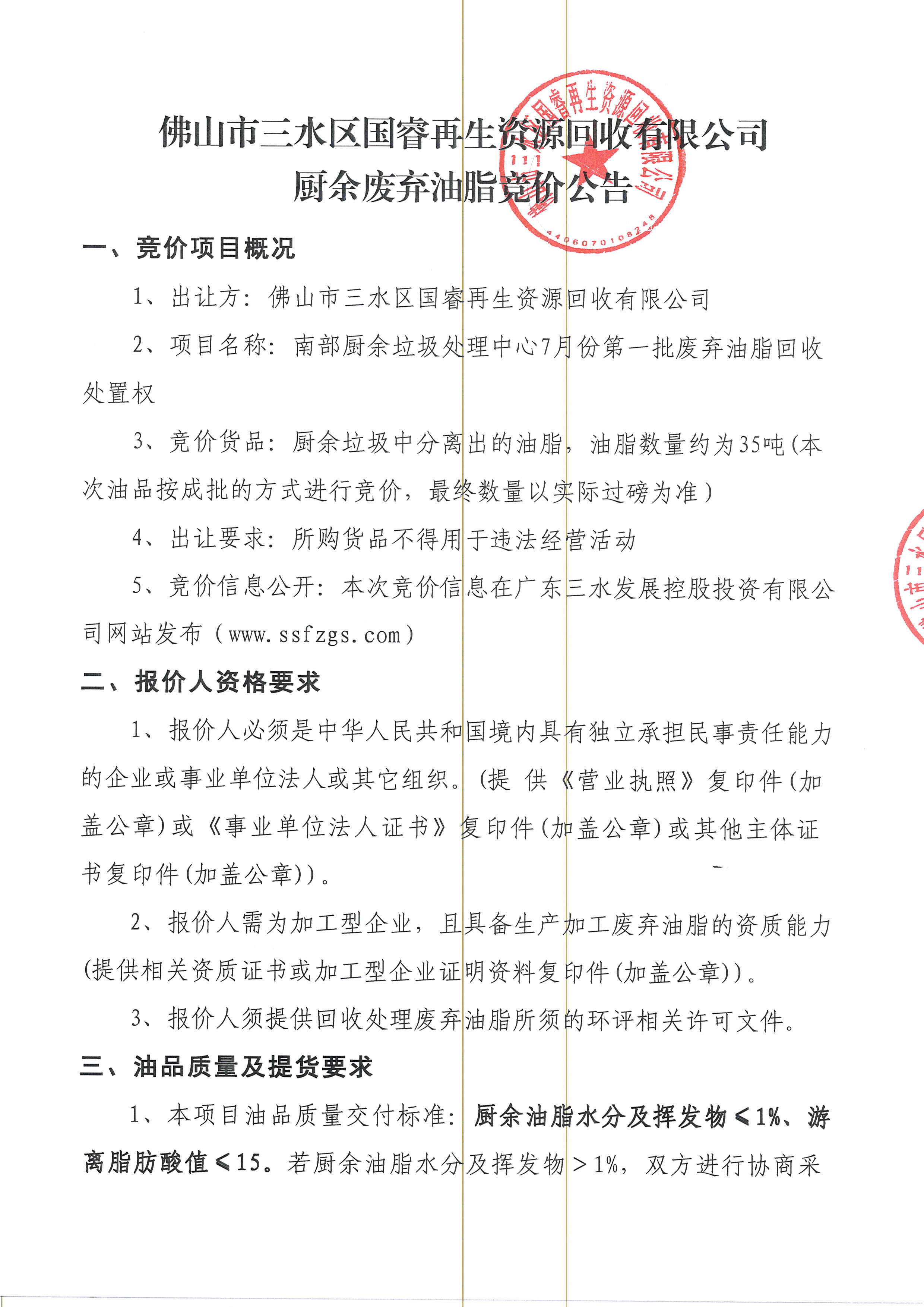 佛山市三水区国睿再生资源回收有限公司厨余废弃油脂竞价公告