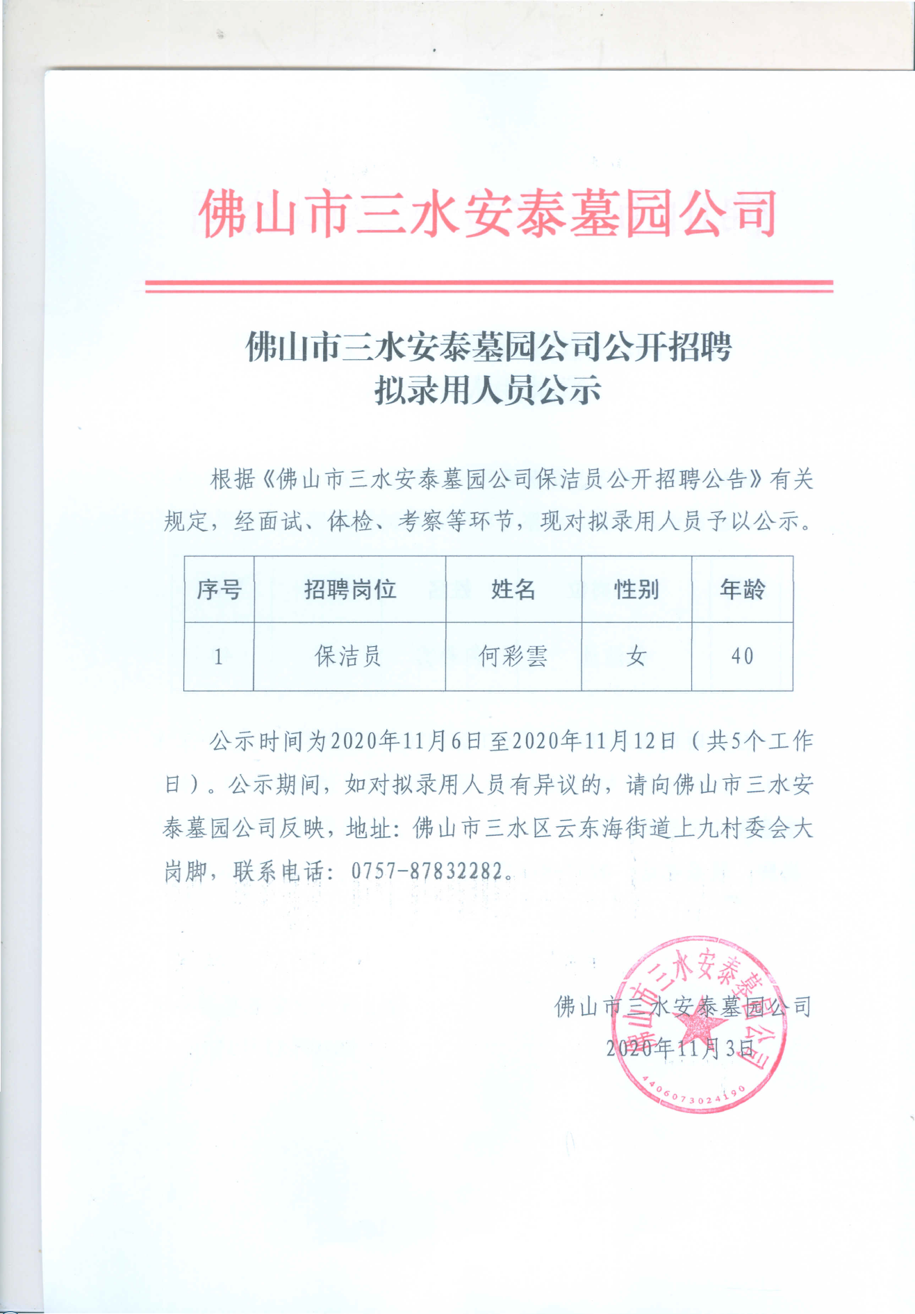 佛山市三水安泰墓园公司公开招聘拟录用人员公示