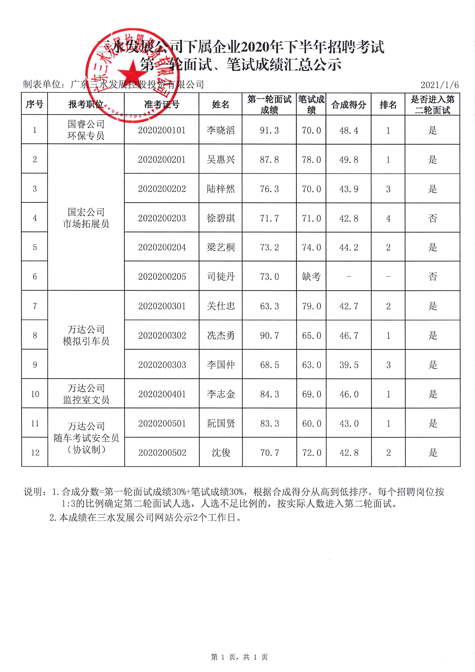 PA视讯集团游戏公司下属企业2020年下半年招聘考试第一轮面试、笔试成绩汇总公示