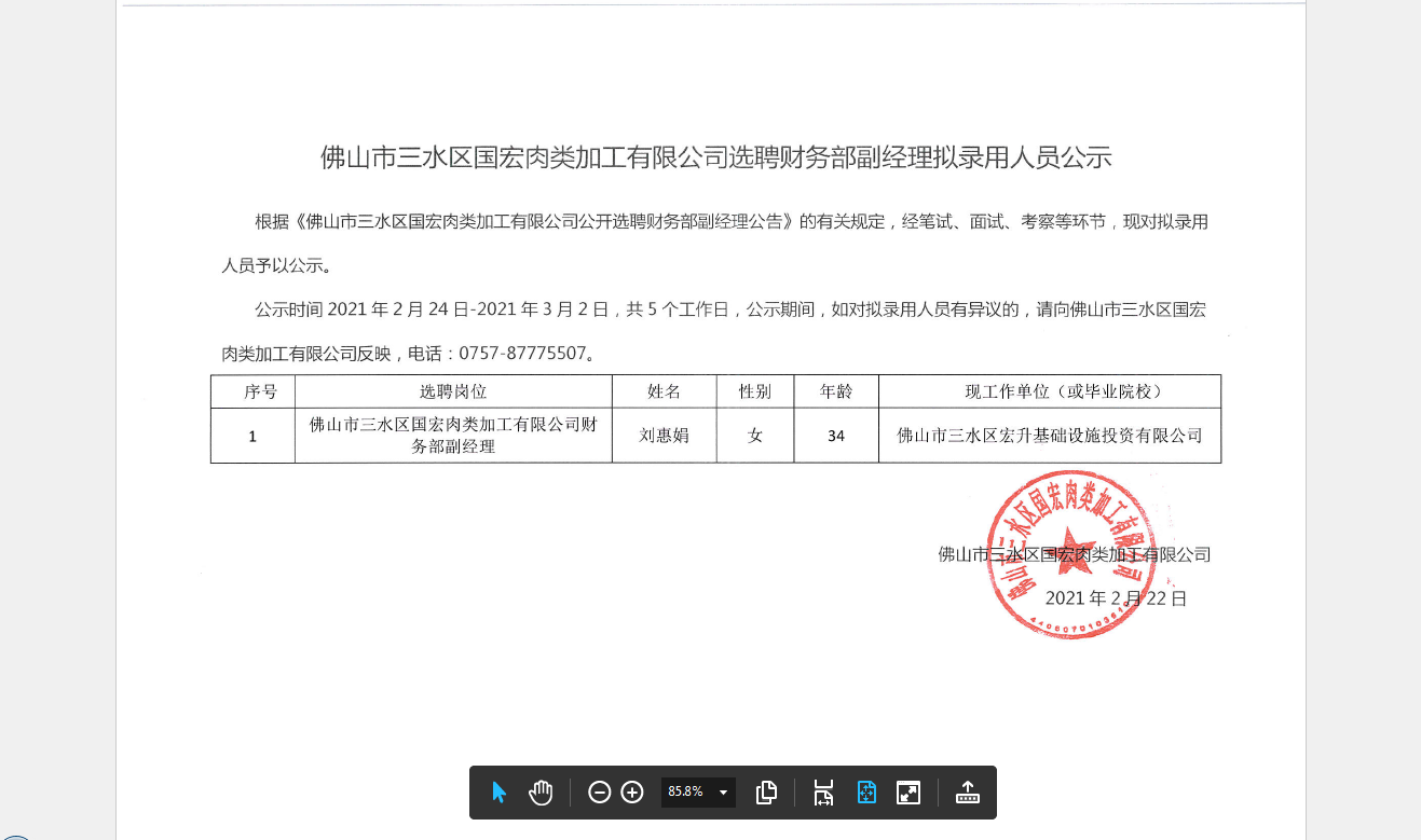 佛山市三水区国宏肉类加工有限公司选聘财务部副经理拟录用人员公示