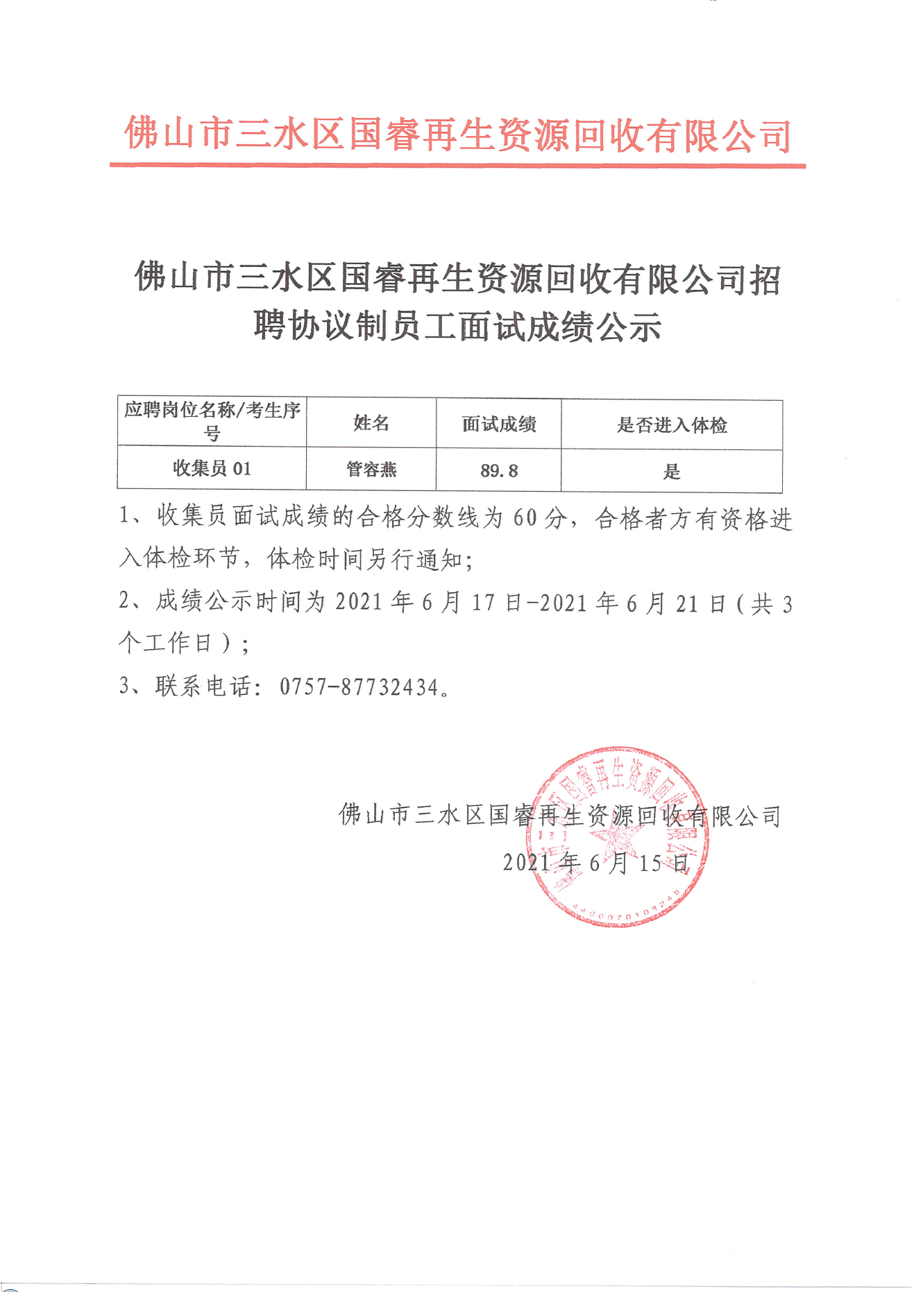 佛山市三水区国睿再生资源回收有限公司招聘协议制员工面试成绩公示