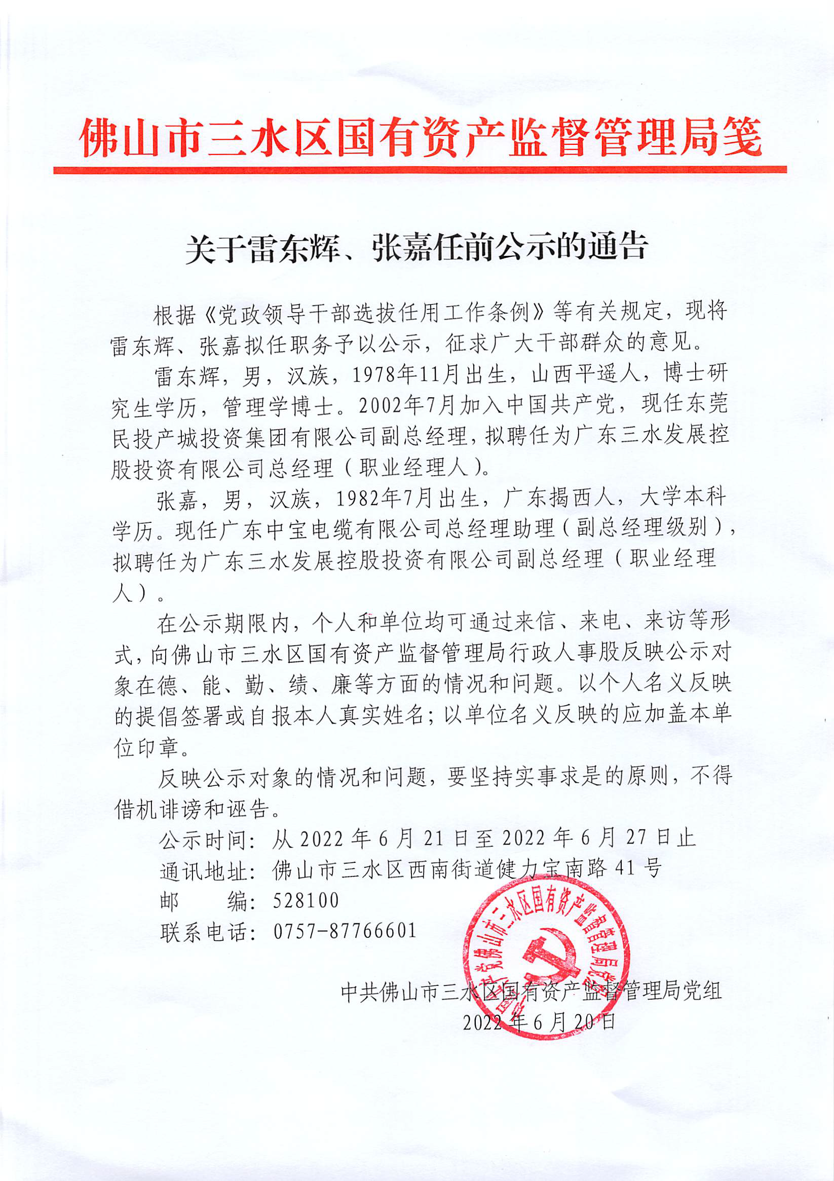 关于雷东辉、张嘉任前公示的通告