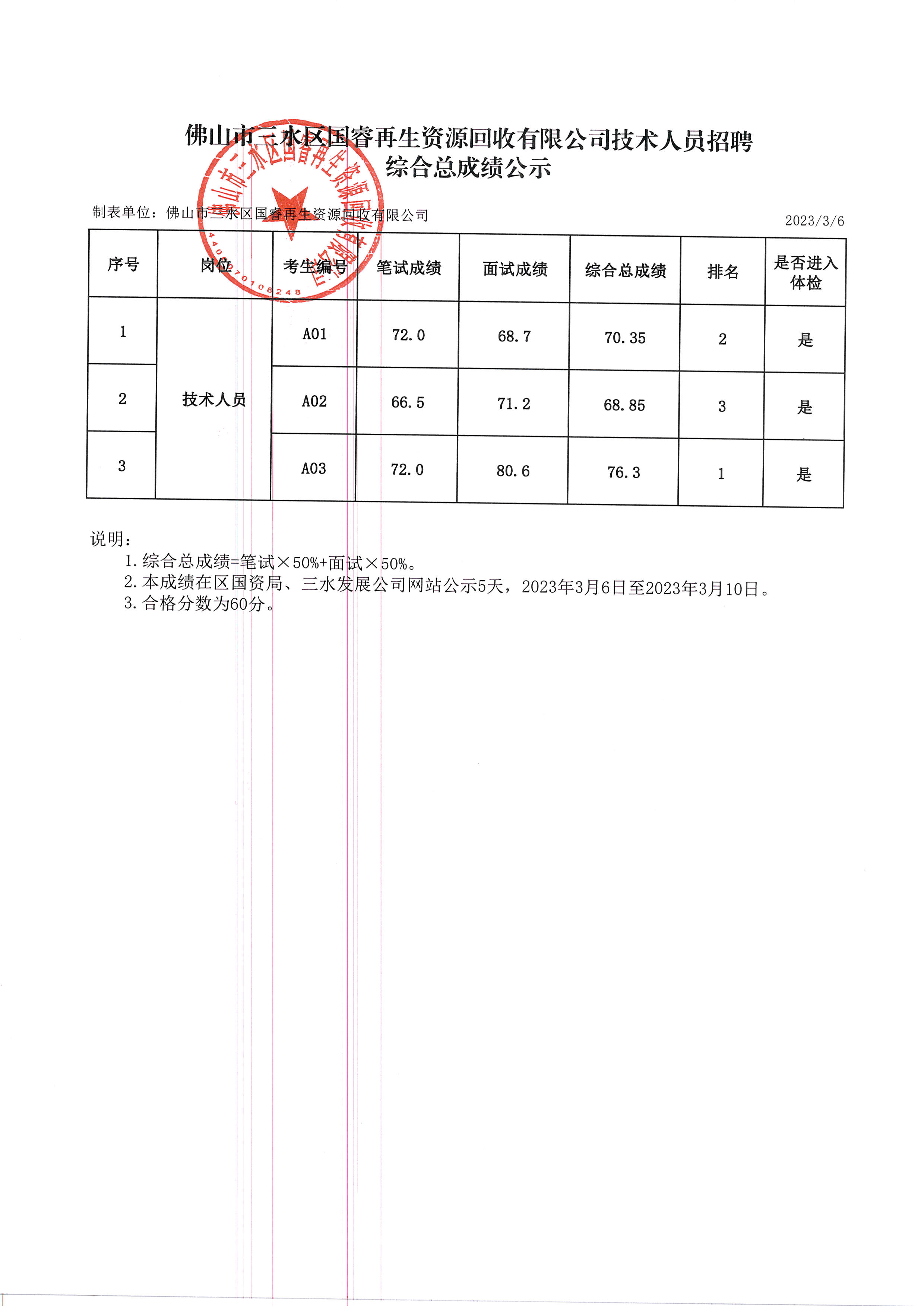 佛山市三水区国睿再生资源回收有限公司技术人员招聘综合总成绩公示