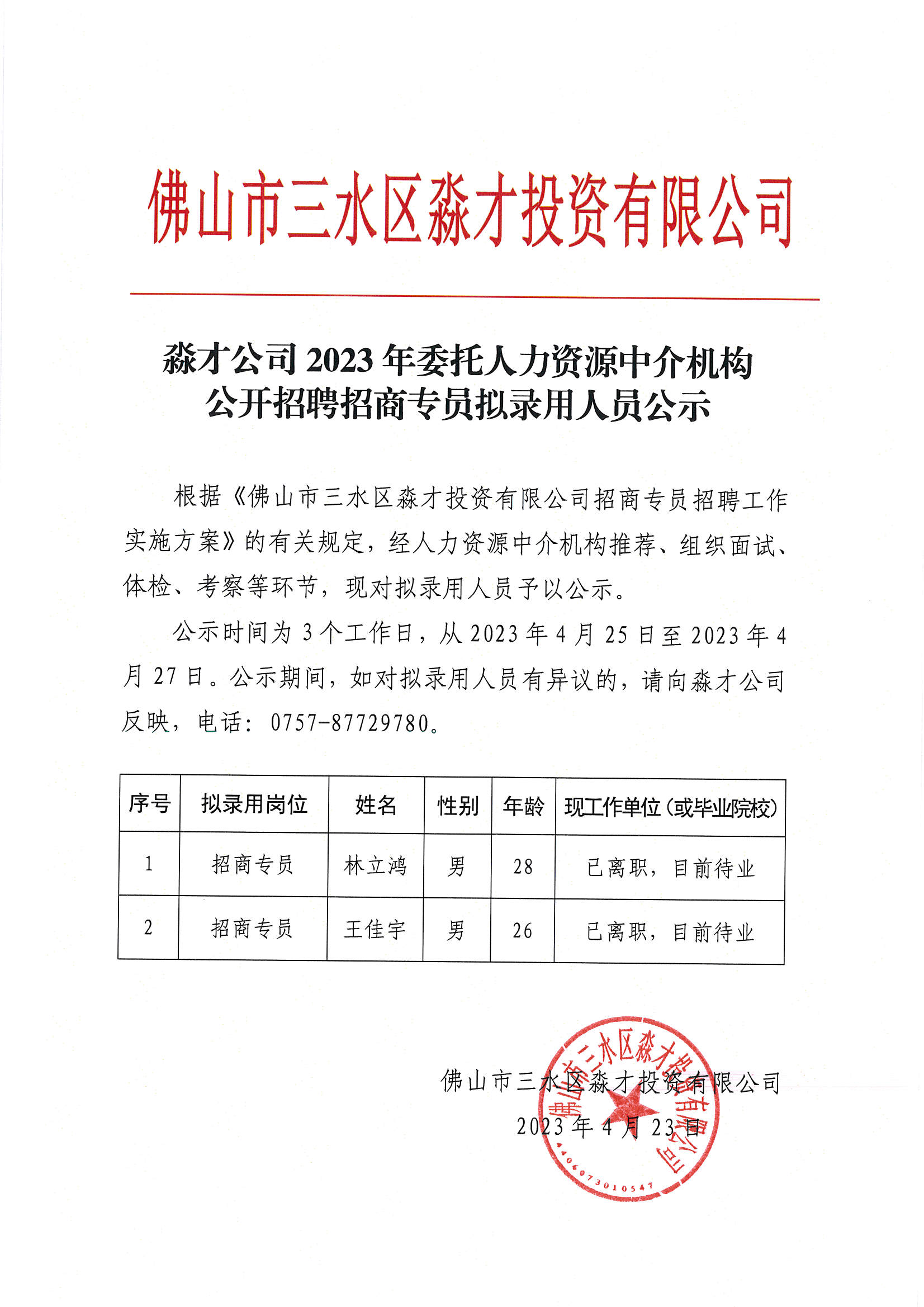 淼才公司2023年委托人力资源中介机构公开招聘招商专员拟录用人员公示