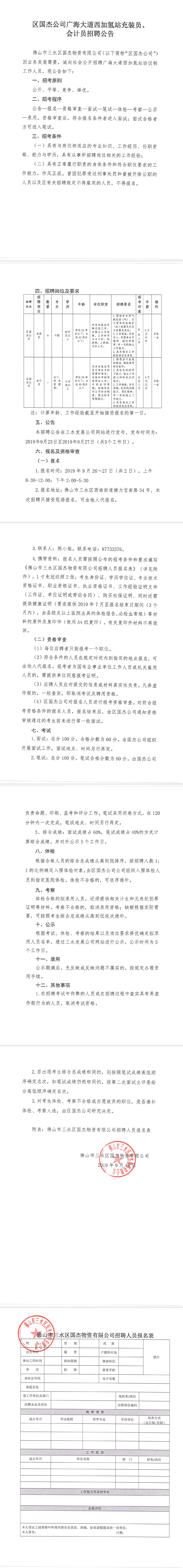 区国杰公司广海大道西加氢站充装员、会计员招聘公告
