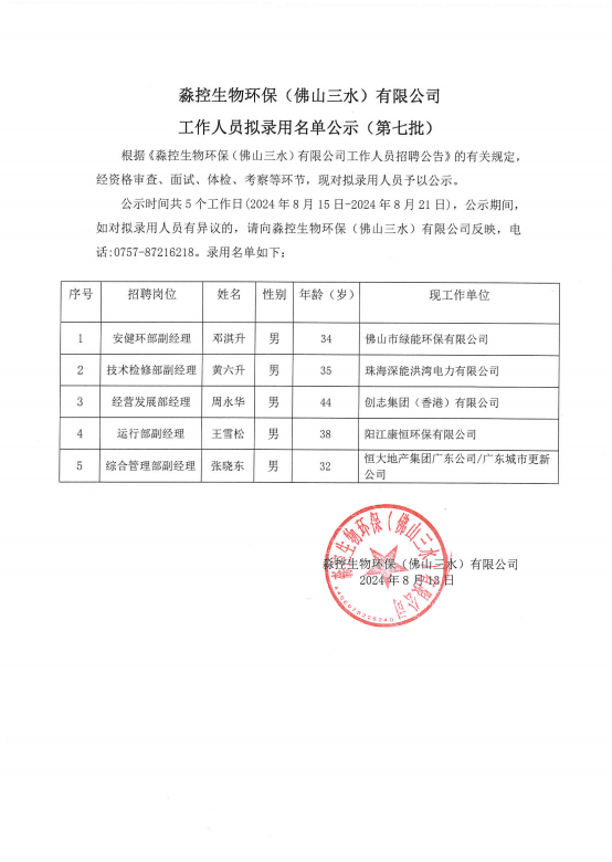 淼控生物环保(佛山三水)有限公司 工作人员拟录用名单公示(第七批)