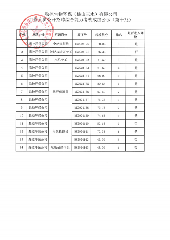 淼控生物环保(佛山三水)有限公司工作人员公开招聘综合能力考核成绩公示(第十批)