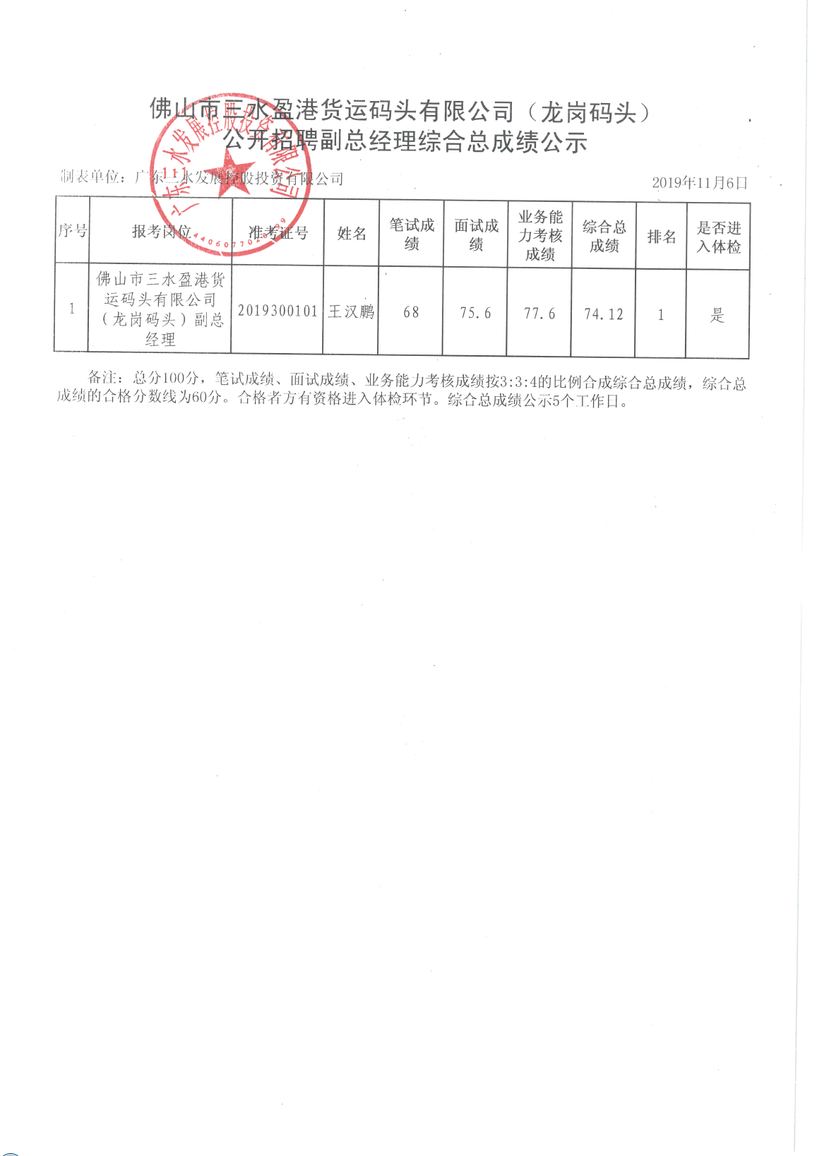 佛山市三水盈港货运码头有限公司(龙岗码头)公开招聘副总经理综合总成绩公示