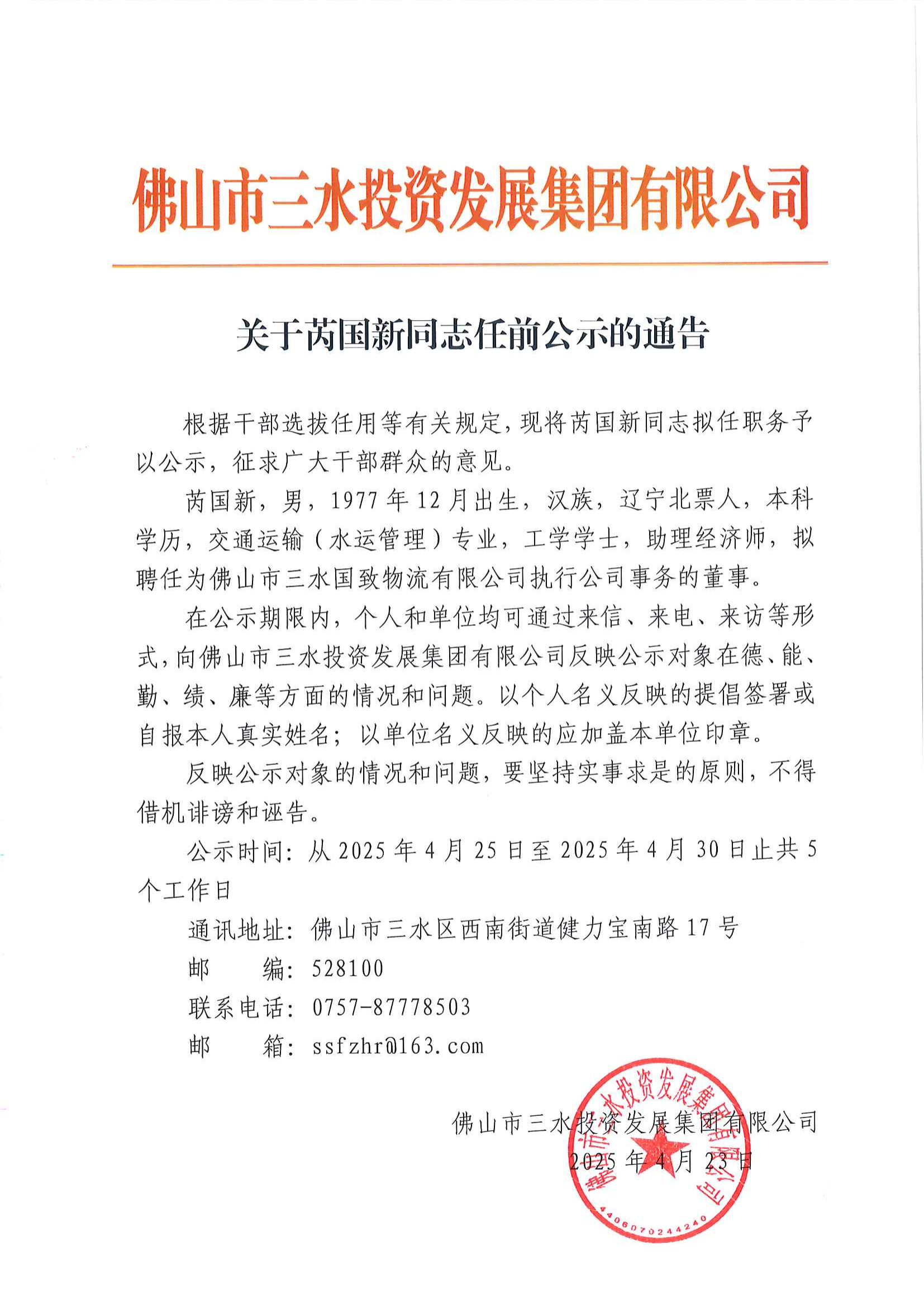 关于芮国新同志任前公示的通告